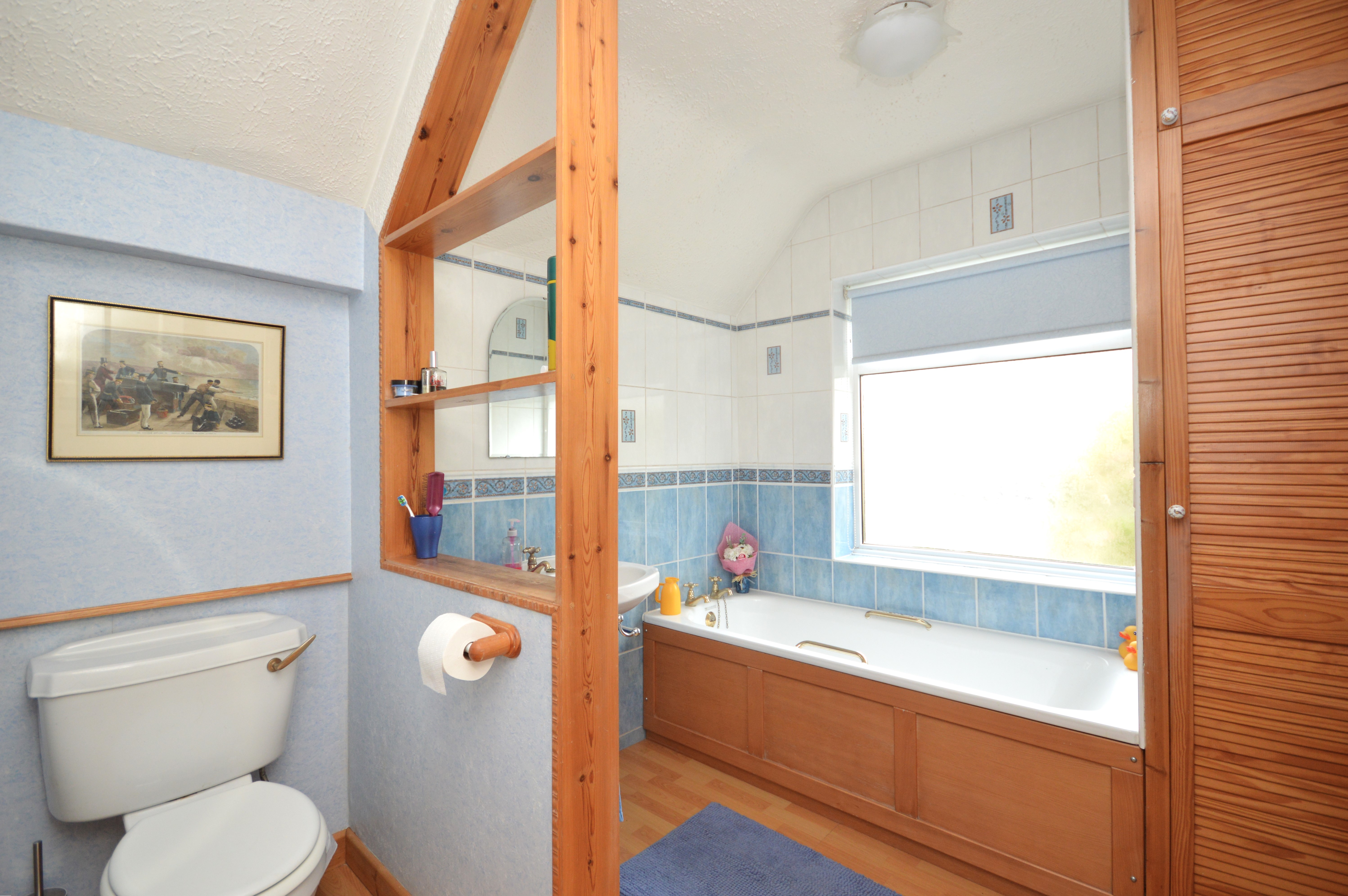 UPVC frosted, double glazed window to the front of the property, full sized bath, pedestal style hand basin, close coupled WC and shelving area. Laminate wood flooring, part tiled walls, radiator and storage cupboard.