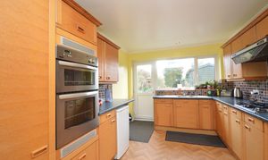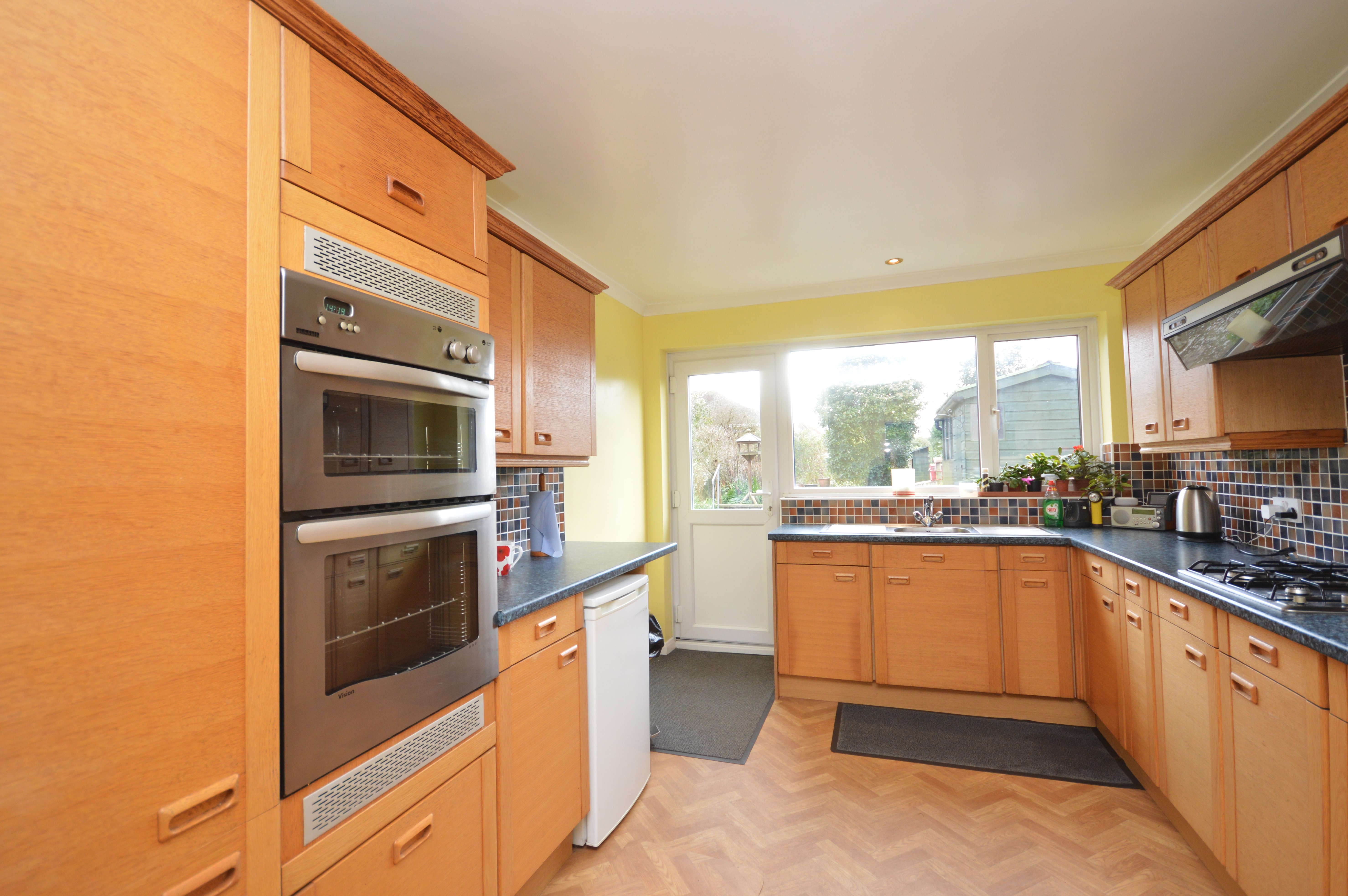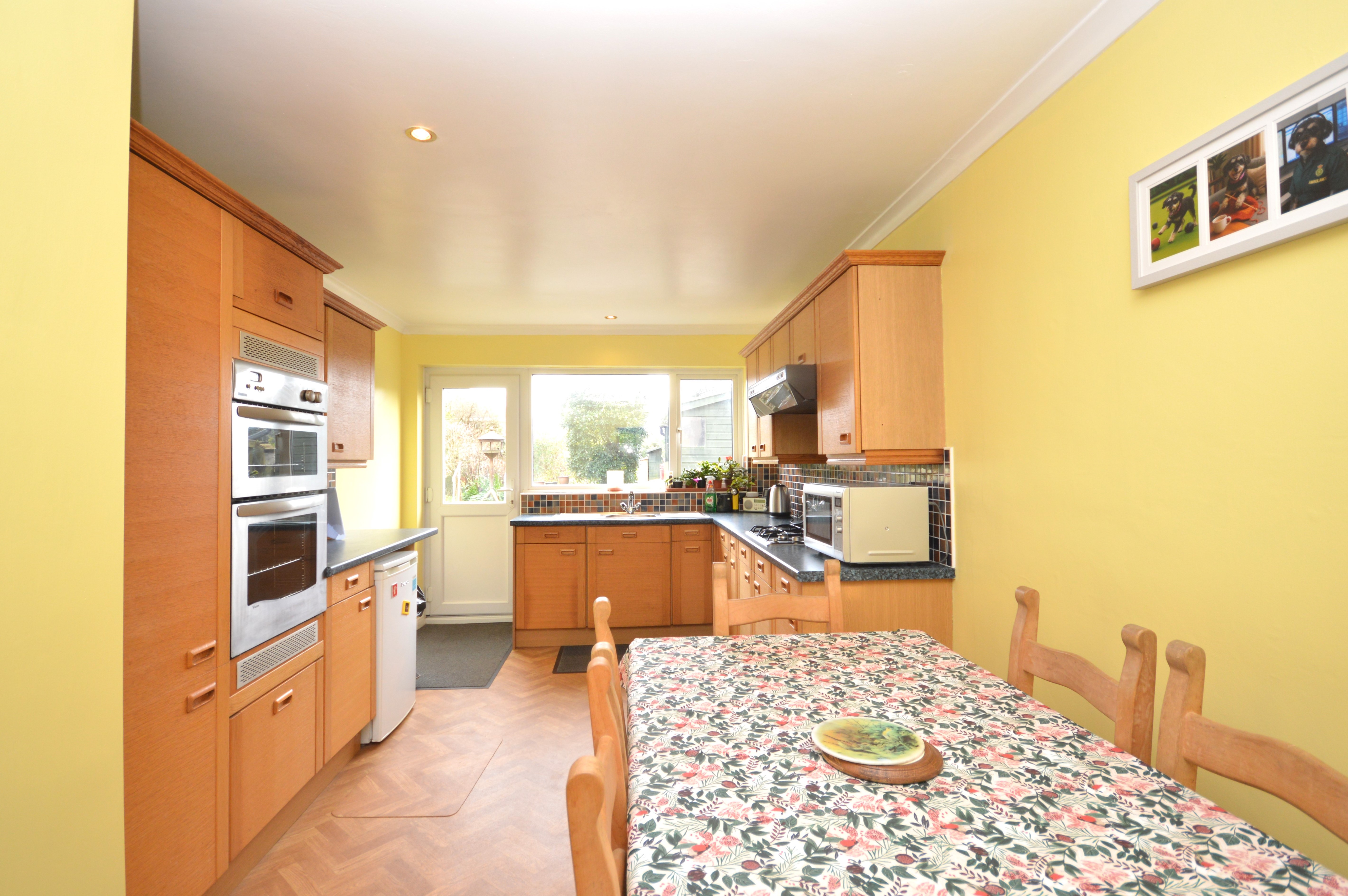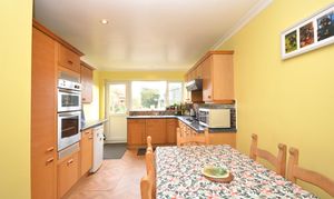 Large UPVC double glazed windows to the rear of the property, overlooking the garden with a UPVC double glazed door leading out to the garden. Two radiators, vinyl flooring, matching wall and base units with a gas hob & extractor fan. There is a double oven and space for a fridge/freezer. This room also has coving and a large space for a dining table.