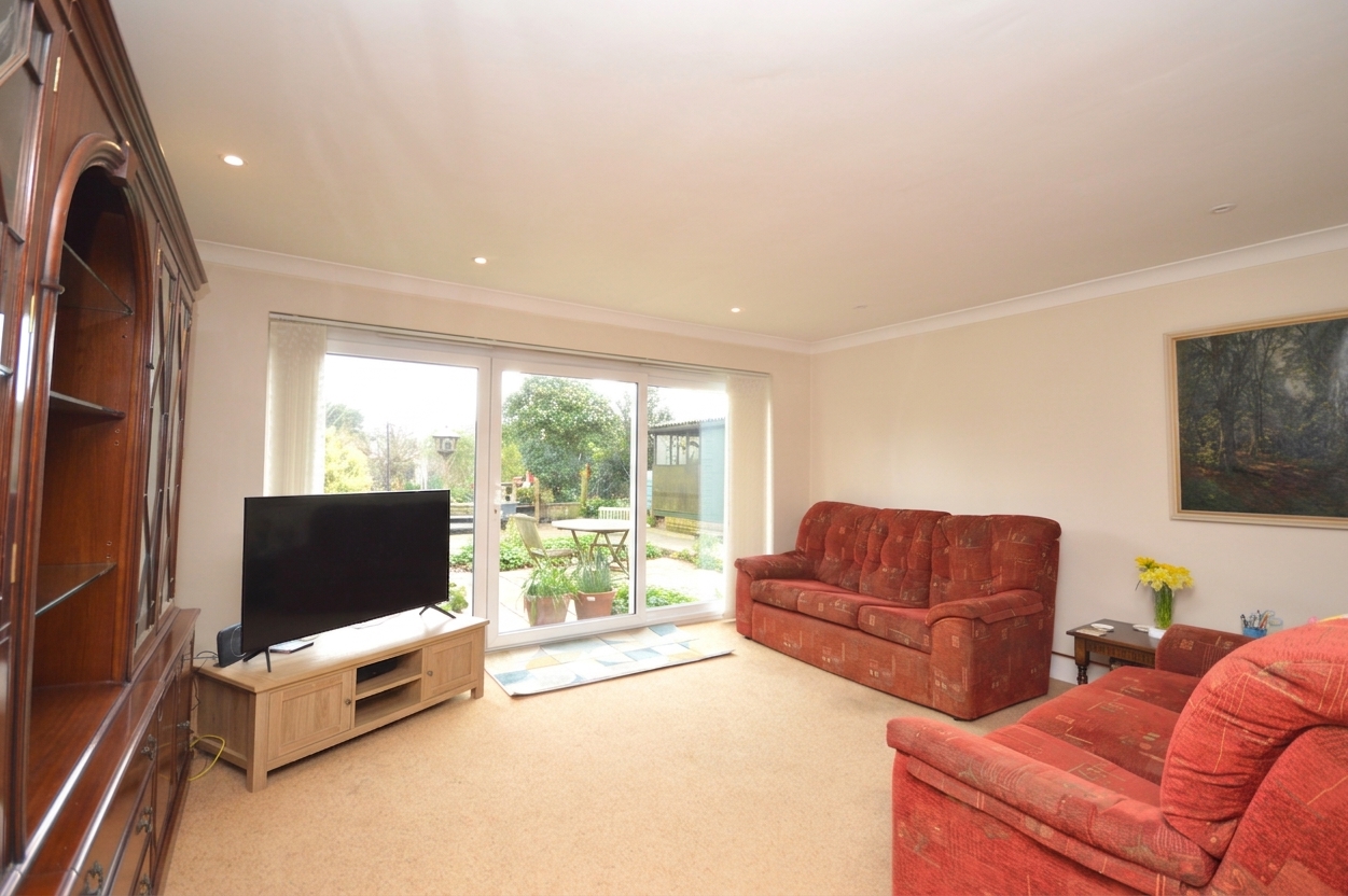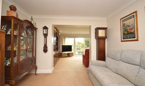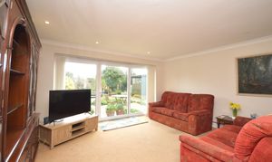 Extension to the rear, large UPVC patio style French doors with fitted blinds leading out to the garden, carpeted floor coverings, feature brick wall, coving and a radiator.