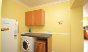 Internal room with natural light from the extension on the kitchen. Vinyl flooring and space for a washing machine and a dishwasher or tumble dryer. Space for freestanding fridge or fridge freezer with a wall mounted storage cupboard, an opening to;