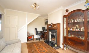 Internal room, open plan to the extension (Lounge) with a beautiful open fireplace with wooden surround and carpeted floor coverings. Under stairs storage, currently used as an office space/desk area. Radiator and coving. Leading onto;