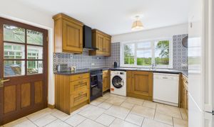 Featuring a range of base and wall units, working surfaces and tiled splash backs and fitted with a stainless steel sink. Appliances include a washing machine, dishwasher, fridge/freezer, cooker with double oven, four ring hob and extractor hood. Window to the rear. Side door to the patio area and garden. Floor mounted oil-fired boiler.