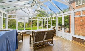 Of Hardwood frame construction on a brick base with hardwood rafters and glass roof. French doors to the patio area and garden. Two wall mounted electric heaters. Ceiling fan. Views of sloping garden vista.