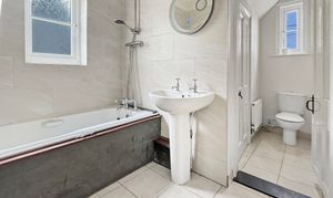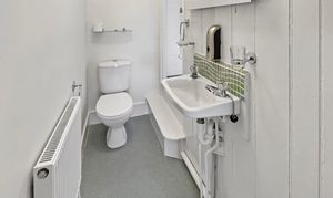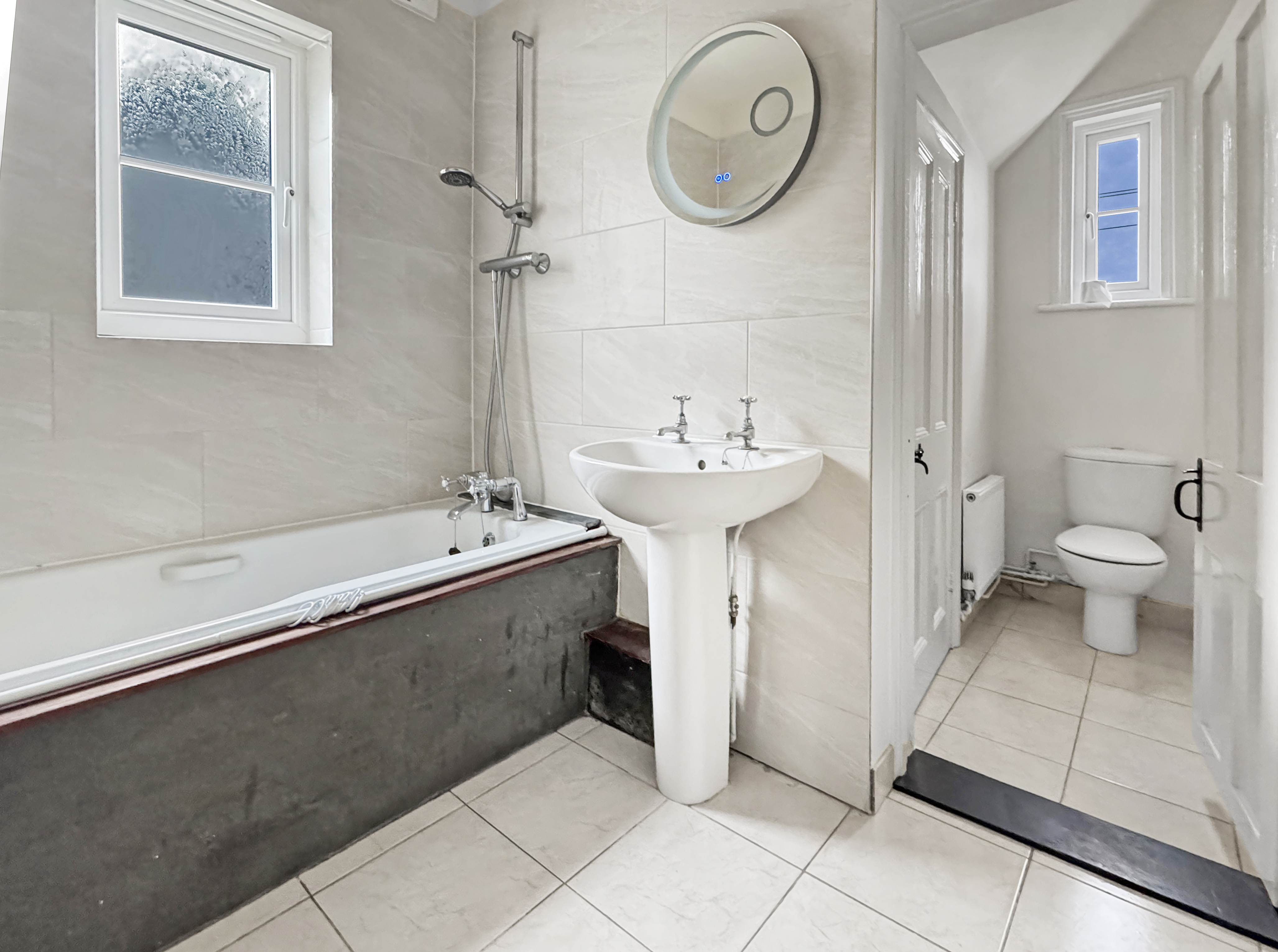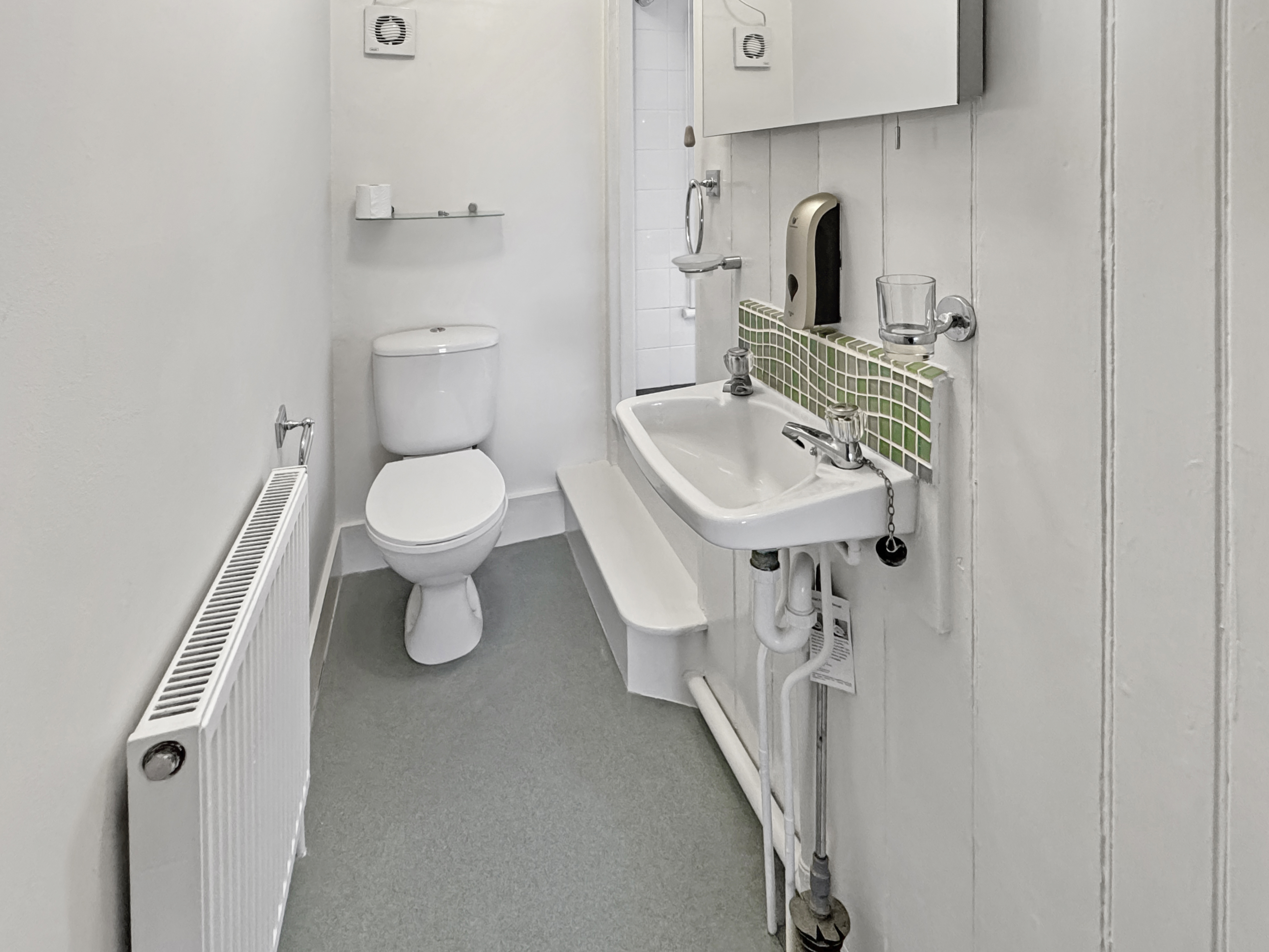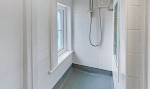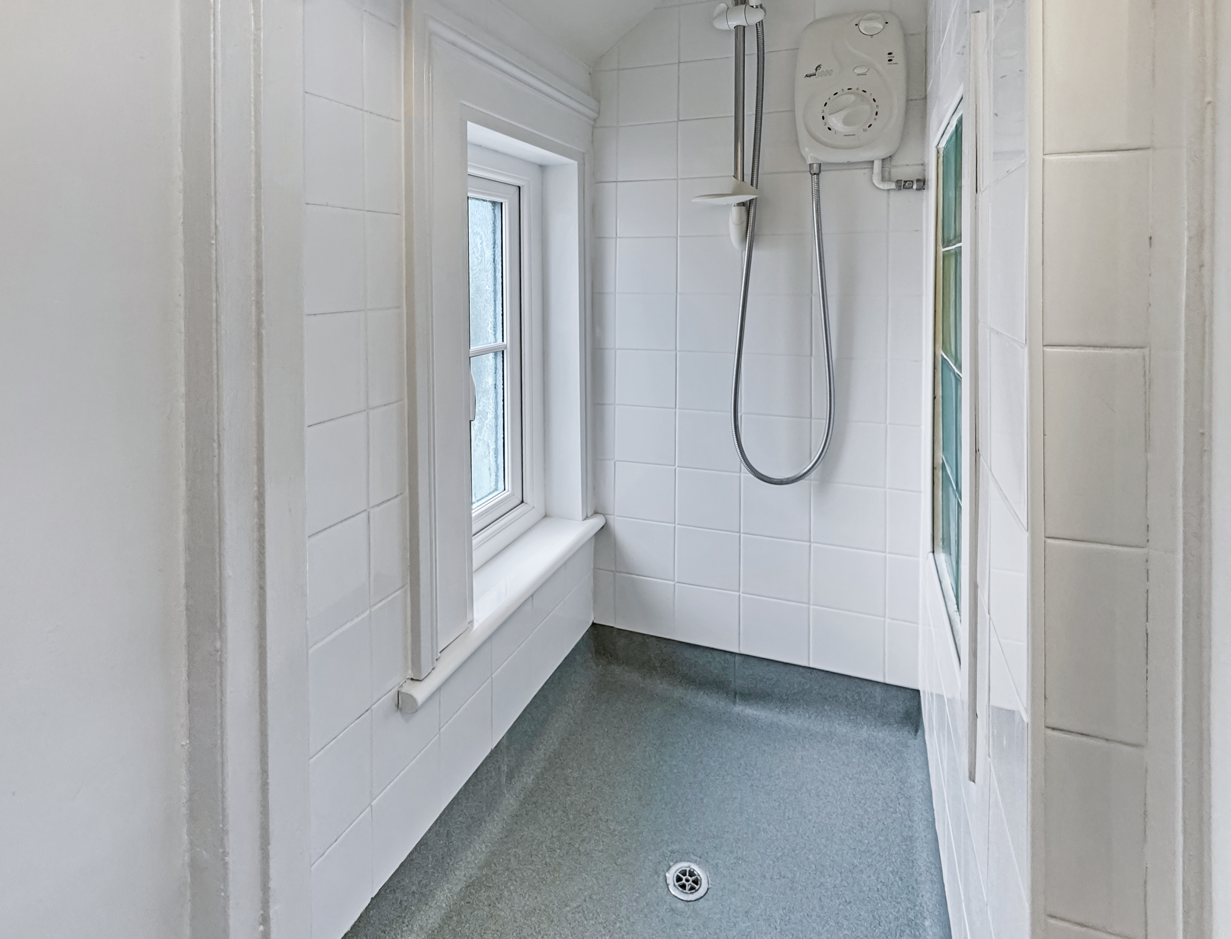 Shower Room: A spacious and light bathroom featuring a small shower enclosure, basin, and W/C.