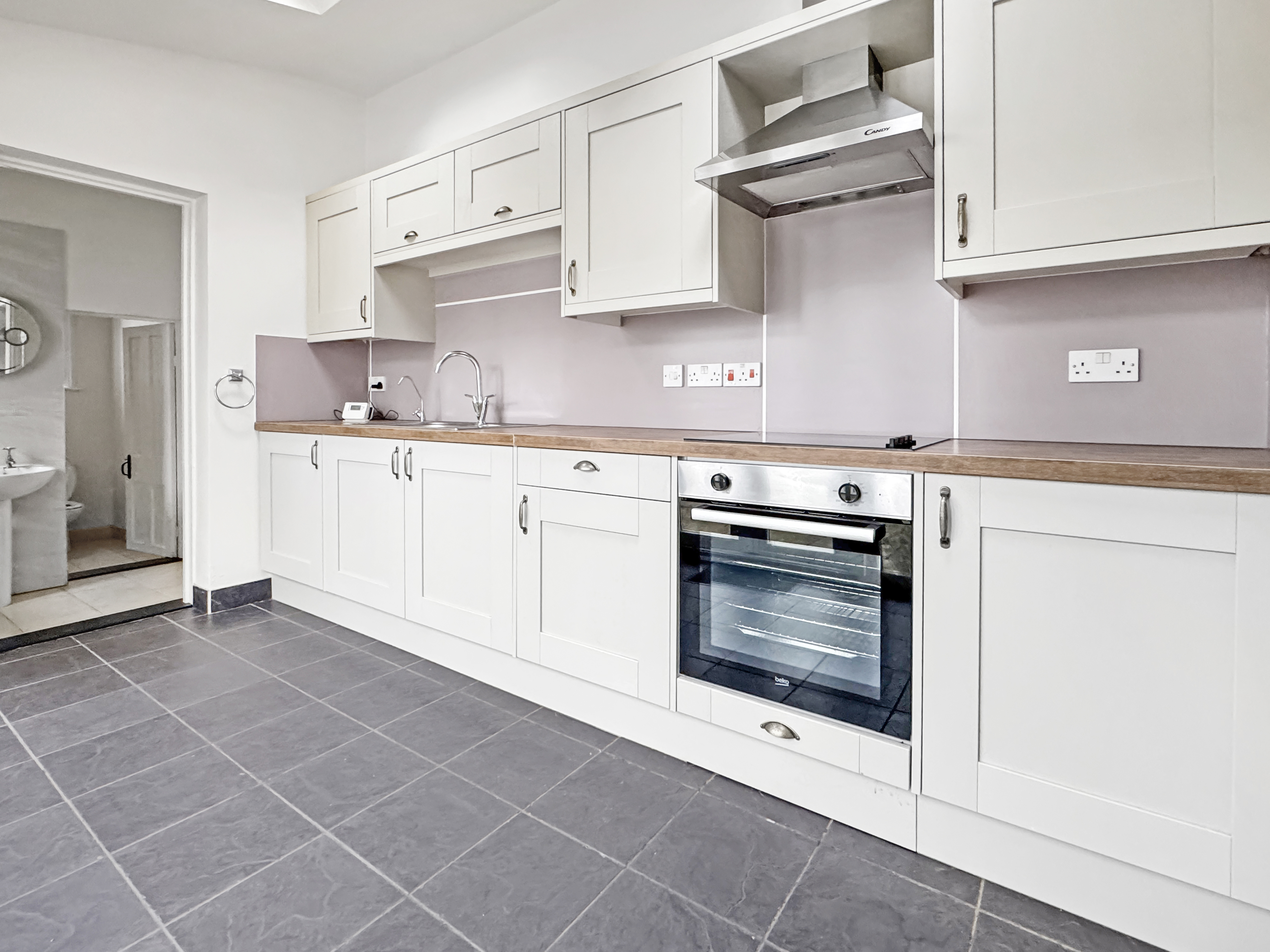 Kitchen: This bright and modern kitchen boasts ample fitted units for storage, integrated fridge, enhanced by a skylight and large double doors that flood the space with natural light.