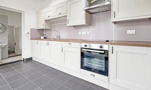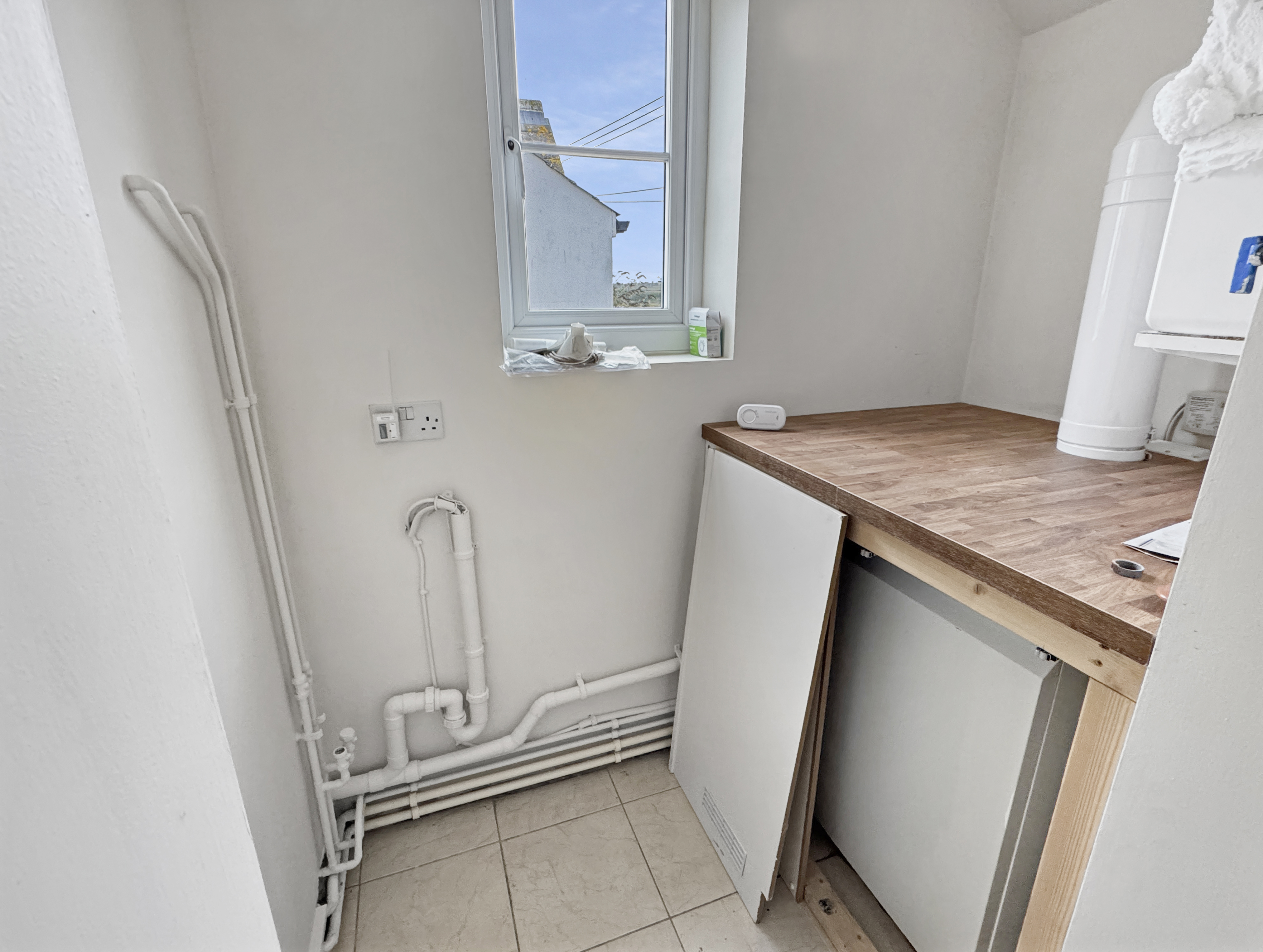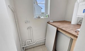 Bathroom: Adjacent to the kitchen, the bathroom features a white suite with a shower over the bath, a hand basin, and a separate W/C. Additionally, a utility space and the boiler are conveniently enclosed, water softener and space for a washing machine.