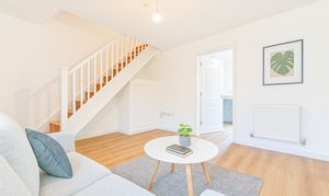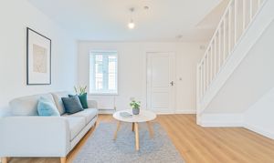 On the ground floor, the welcoming hallway gives access to the main living space and a convenient cloakroom with WC and hand basin. The bright and inviting living room provides a comfortable area for relaxation and entertaining, with stairs leading to the first floor. To the rear, the beautifully designed open-plan kitchen/diner creates a sociable hub for the home. Finished to a high standard, it features modern fitted units, integrated appliances, and ample space for dining. French doors open out to the rear garden, filling the space with natural light and offering a seamless flow between indoor and outdoor living.