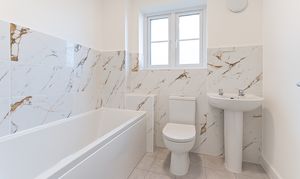 Upstairs, the first floor hosts two well-proportioned bedrooms and a contemporary family bathroom. Each bedroom is tastefully decorated and designed for comfort, while the bathroom features a sleek, modern suite finished with high-quality fixtures and fittings.