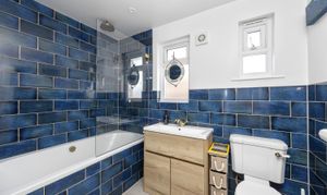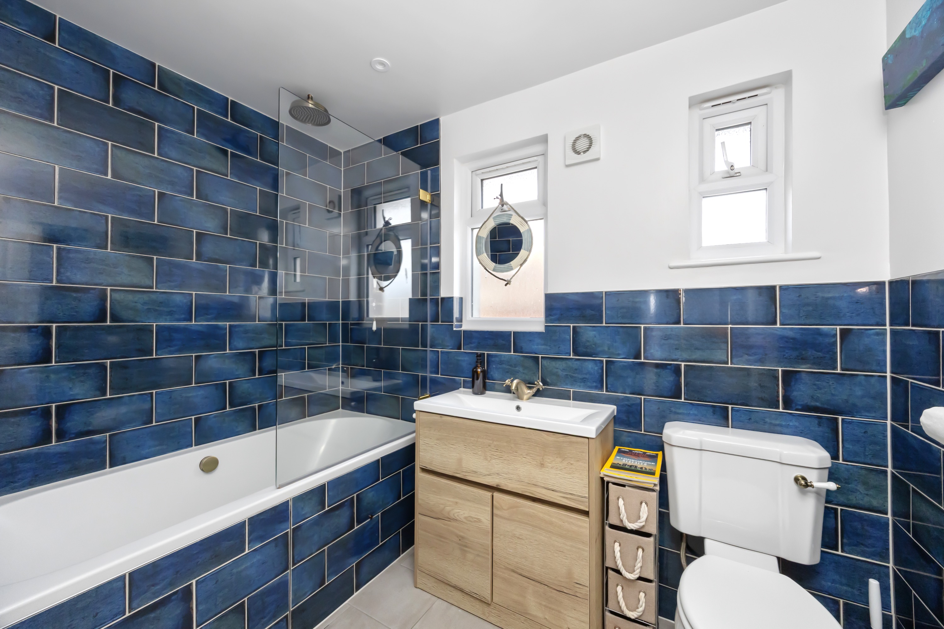 On the first floor, you will find three generously sized double bedrooms. These rooms share a bright and stylish family bathroom, complete with fresh white tiled walls, a deep-soaking bath with a rainforest shower attachment, a modern vanity unit with ample storage, and a WC. Frosted windows provide privacy while allowing in plenty of daylight.