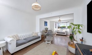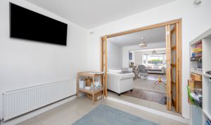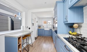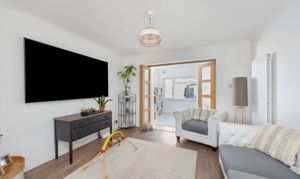 The kitchen is a standout feature, designed to impress with its striking blue cabinetry, complemented by sleek black handles, smooth countertops, and warm wooden flooring. A classic butler sink adds a touch of timeless charm, while integrated appliances are seamlessly incorporated for a polished look. A cosy breakfast bar with seating for two provides the perfect spot for casual dining or morning coffee. The living and dining areas flow effortlessly together, creating a versatile and open-plan layout ideal for both family life and entertaining guests. A large window in the living room ensures plenty of natural light, enhancing the sense of space and creating a warm, inviting atmosphere. Double doors open into another reception room which works well as a play room or study.
