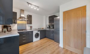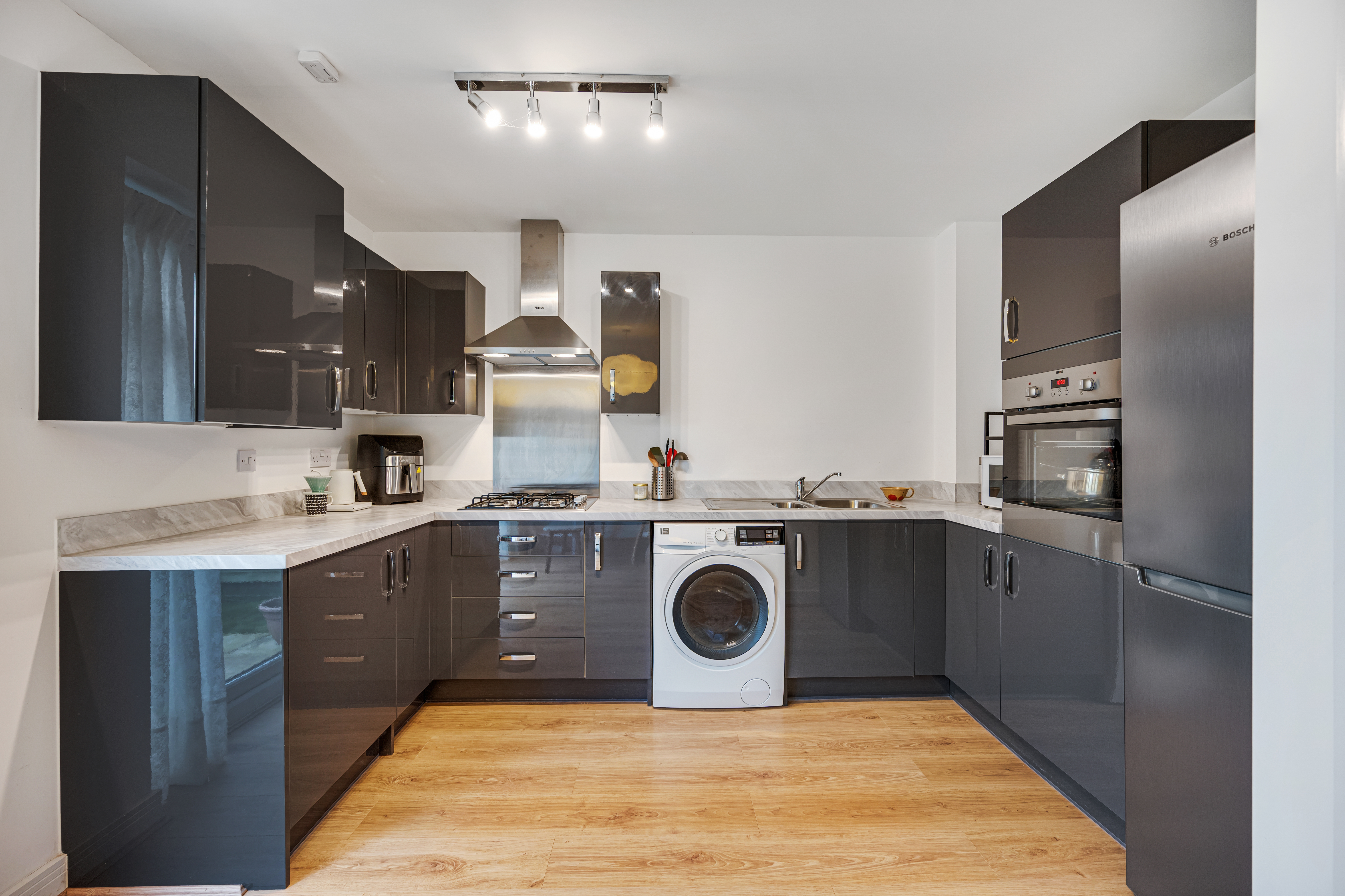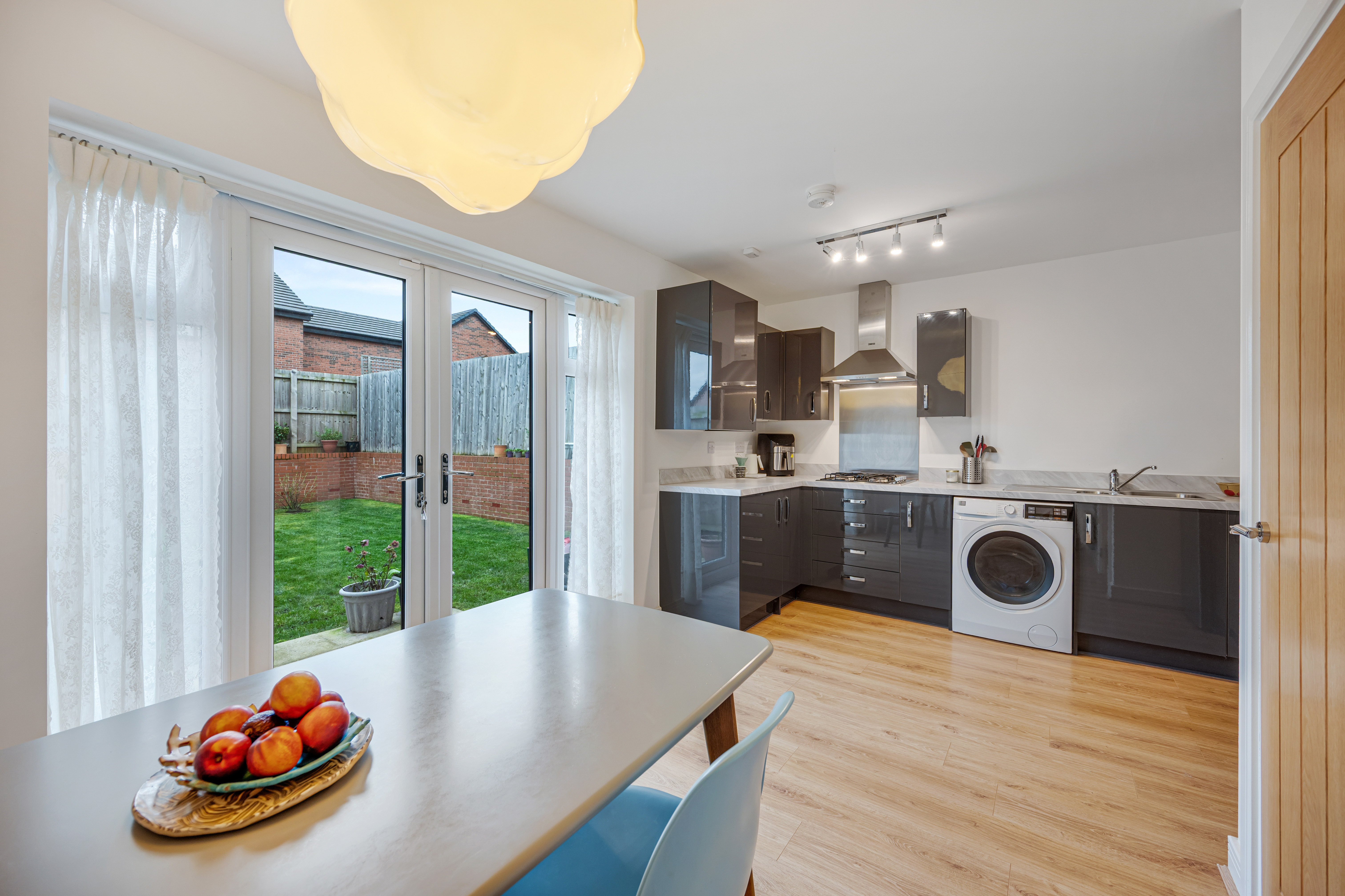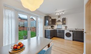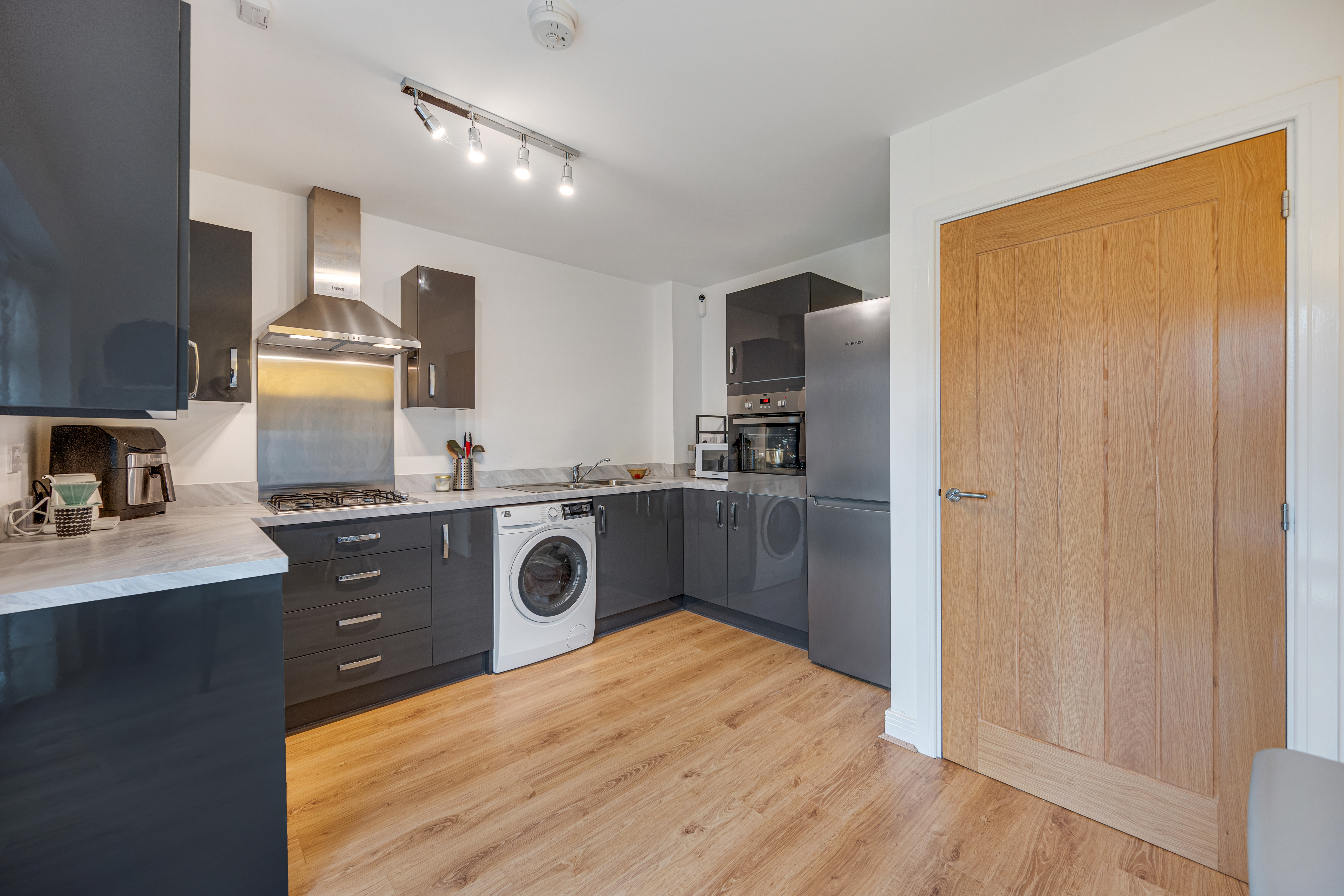This stylishly presented freehold home offers an abundance of spacious and contemporary living accommodation with practical features throughout to include; a welcoming, bright hallway, leading through to a spacious lounge with a split-level staircase and handy under-stairs storage. The heart of the home is the fabulous open-plan kitchen/diner, featuring charcoal grey high-gloss units, stainless steel splash-back, built-in oven, gas hob, and space for appliances. This inviting space boasts french doors opening to the westerly faced, private, enclosed rear garden. A contemporary guest WC adds convenience and completes the ground floor accommodation.