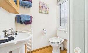 Three piece suite with shower, Wc and sink, laminate flooring, radiator, upvc double glazed frosted window