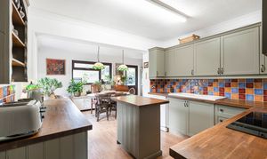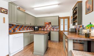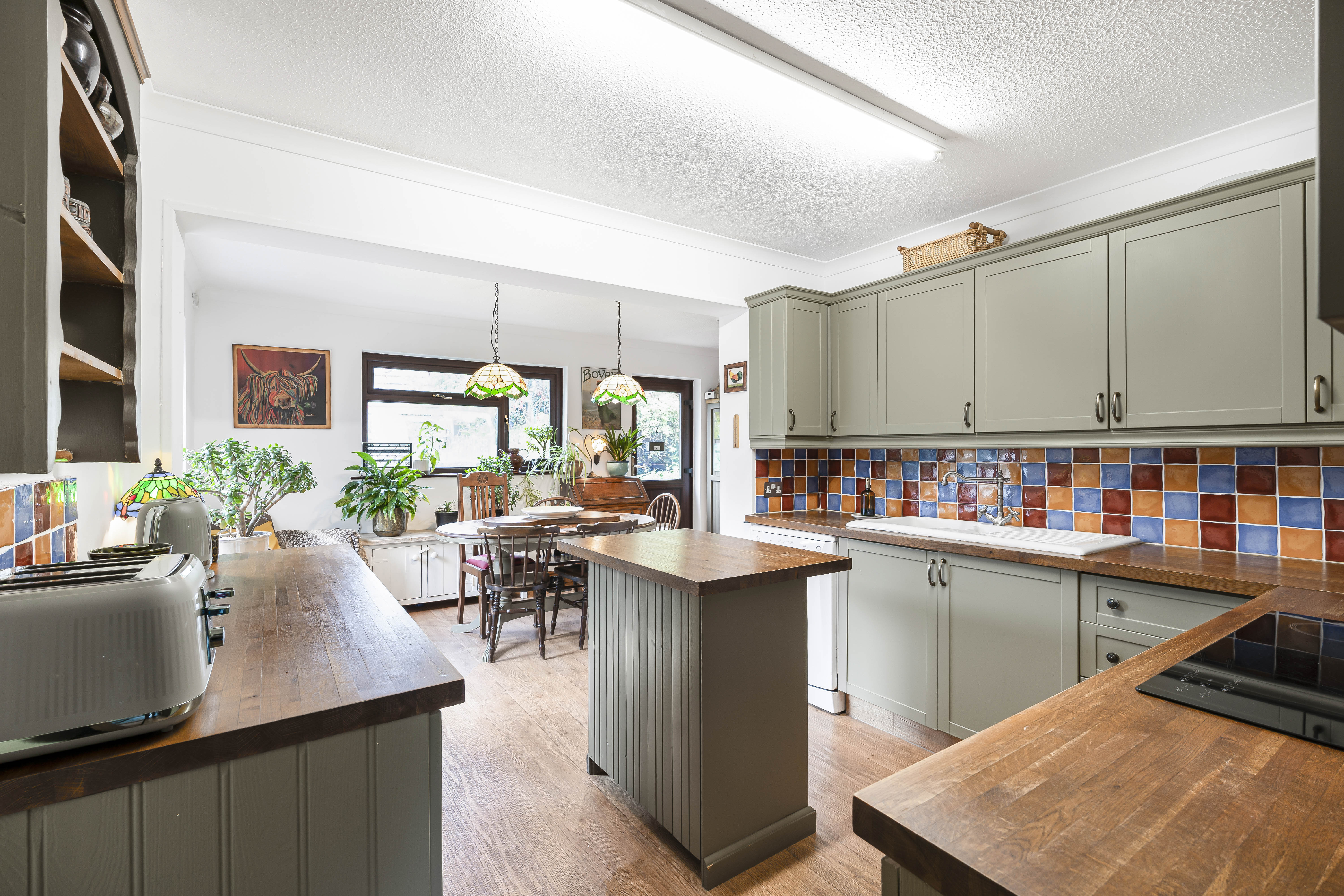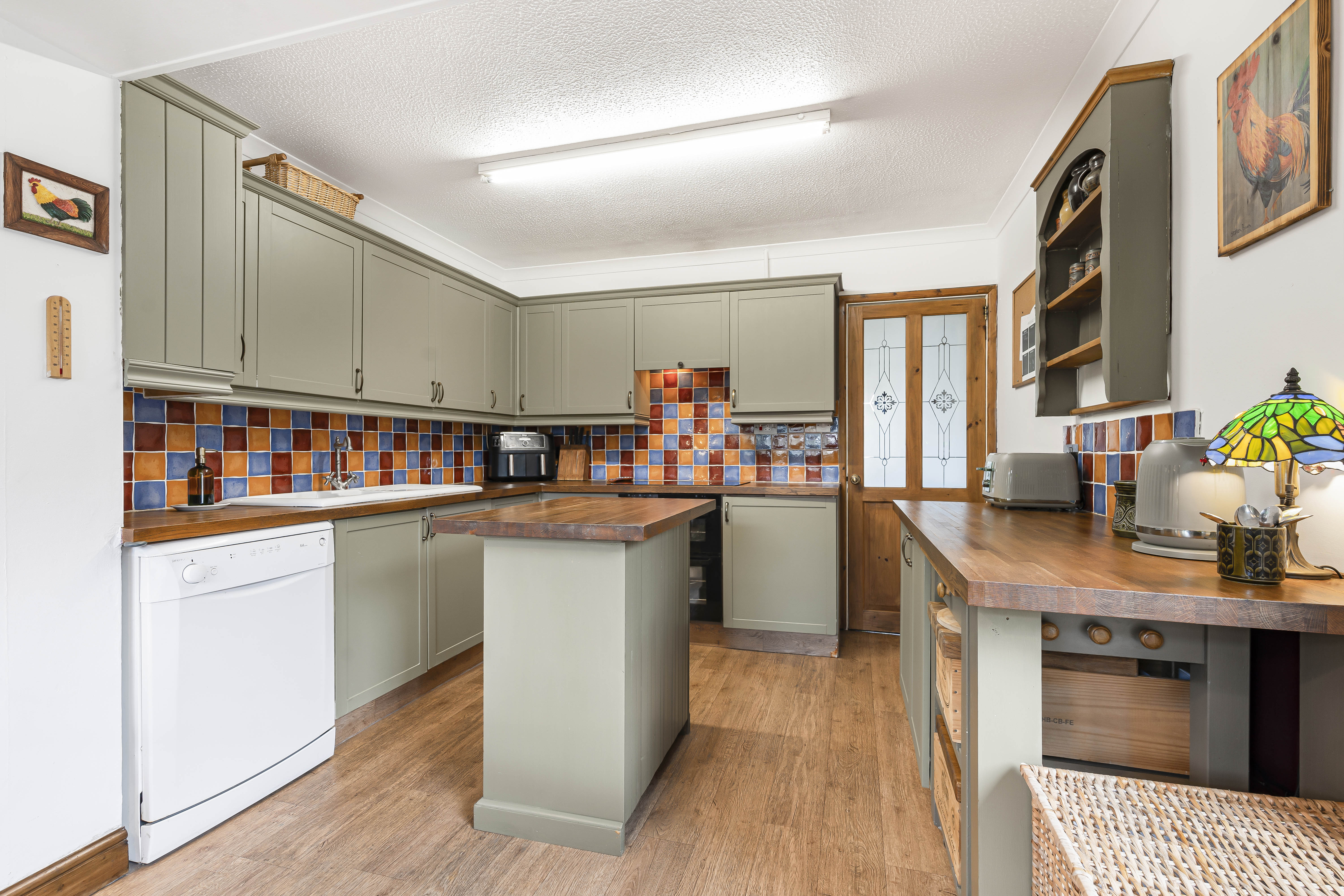 The kitchen is modern with a range of shaker style drawers, base and wall units, solid wooden worktops over, central island, oven, and hob with extractor over, ceramic sink with mixer tap over, tiles splashbacks and space for dishwasher.