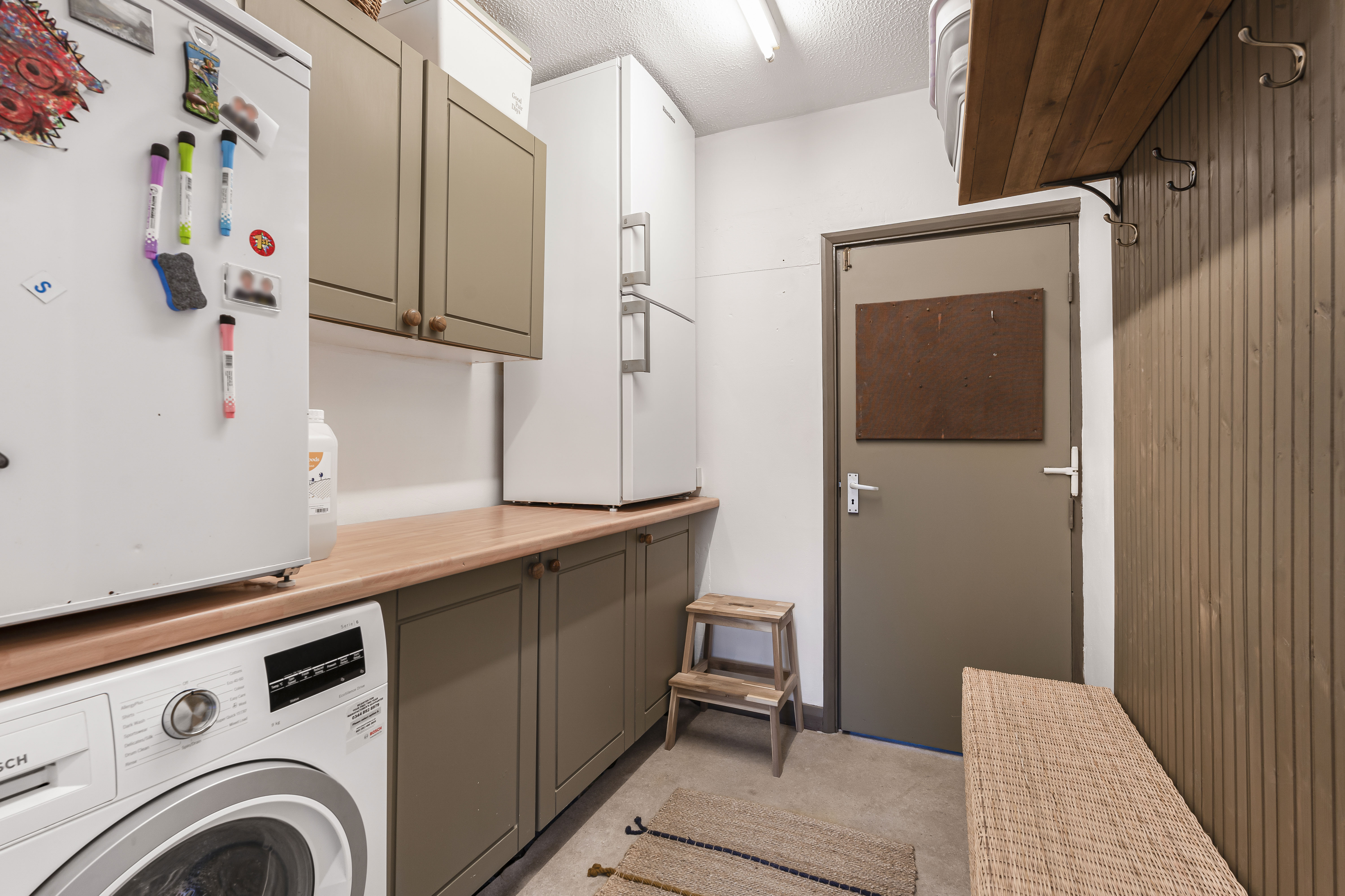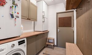 Off this kitchen is a utility room with space for fridge/freezer, plumbing and space for washing machine, further storage, and counter space.