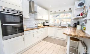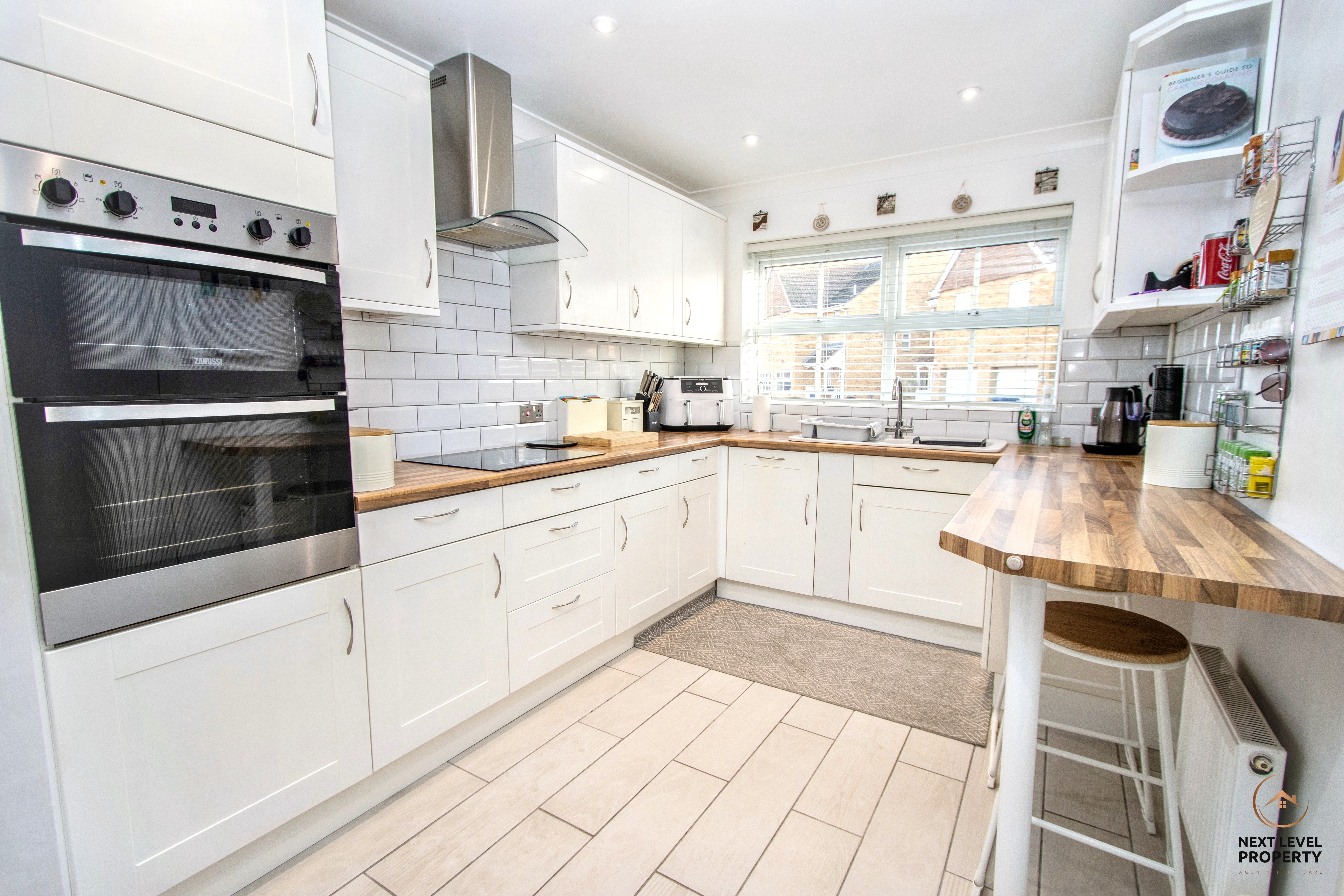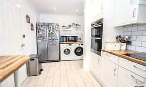 The stylish white kitchen is both smart and practical, featuring a good range of fitted units paired with wood-effect worktops and a white inset sink with mixer tap. Integrated appliances include a double oven and induction hob with stainless steel extractor hood, while there is space for a fridge/freezer, washing machine and tumble dryer. Tiled flooring and tiled splashbacks add a clean finish, with a uPVC double-glazed window to the front bringing in natural light and a side door providing convenient access in and out of the home.