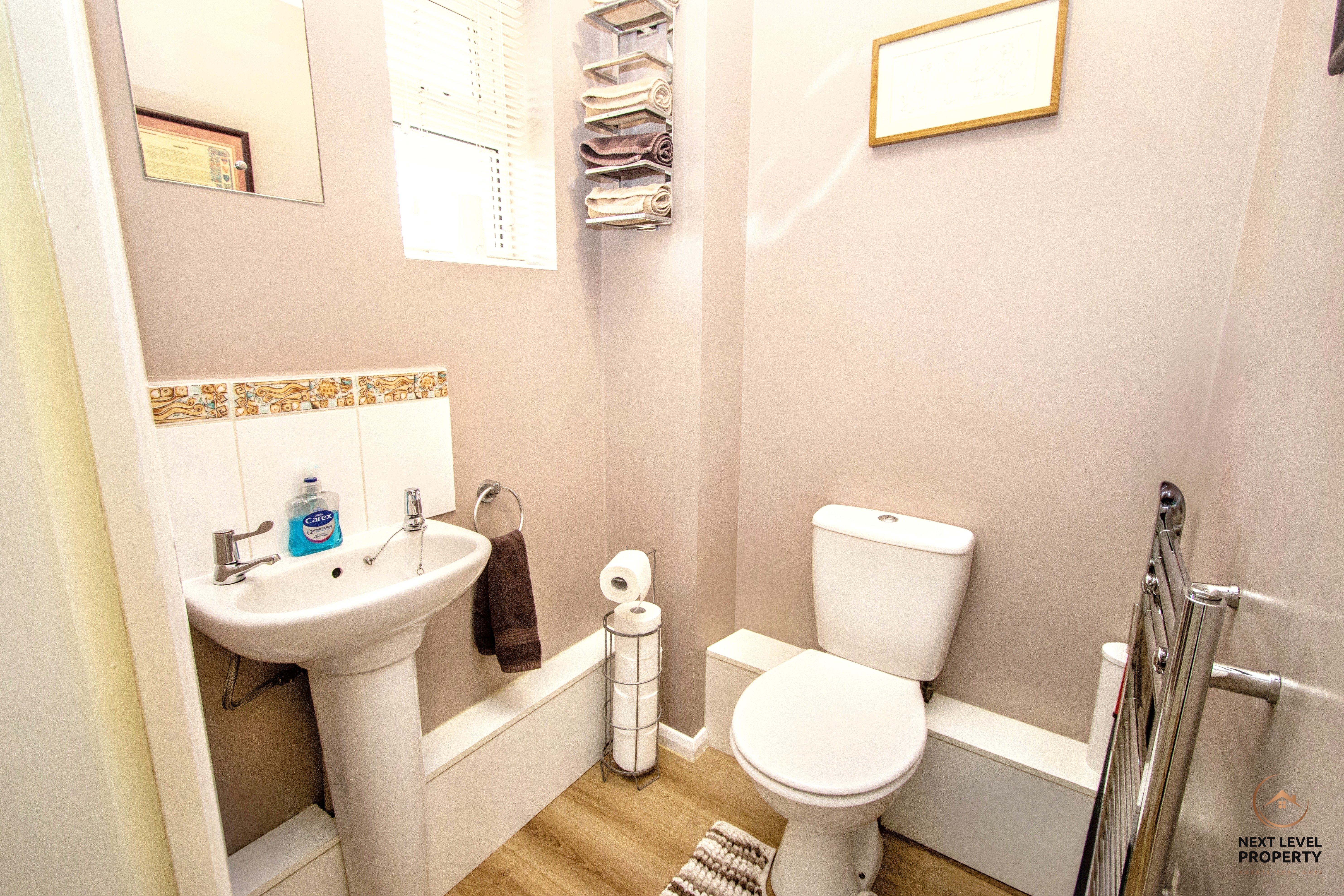 A useful ground floor cloakroom fitted with a close-coupled WC and pedestal hand basin, complemented by a heated towel rail. A uPVC double-glazed window to the front provides natural light and ventilation, making this a practical and well-presented addition to the home.