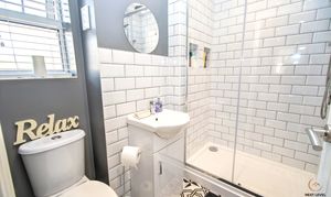 The modern en-suite is smartly finished and well laid out, featuring a close-coupled WC and a hand basin set within a vanity storage unit. A generous shower cubicle with mains-fed shower provides everyday comfort, complemented by tiled splashbacks and a heated towel rail. A uPVC double-glazed window to the side brings in natural light and ventilation.