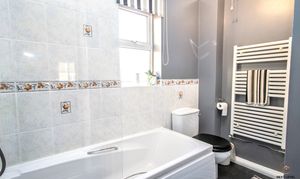 The family bathroom is neatly presented and fitted with a bath, close-coupled WC and a hand basin set within a vanity storage unit, providing useful built-in storage. Tiled splashbacks add a practical finish, while a uPVC double-glazed window to the front allows in natural light and ventilation.