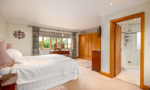 A stunning principal bedroom with windows on two elevations. Inbuilt oak wardrobes and a useful air-conditioning unit. Ensuite shower room with white suite, marble surfaces.