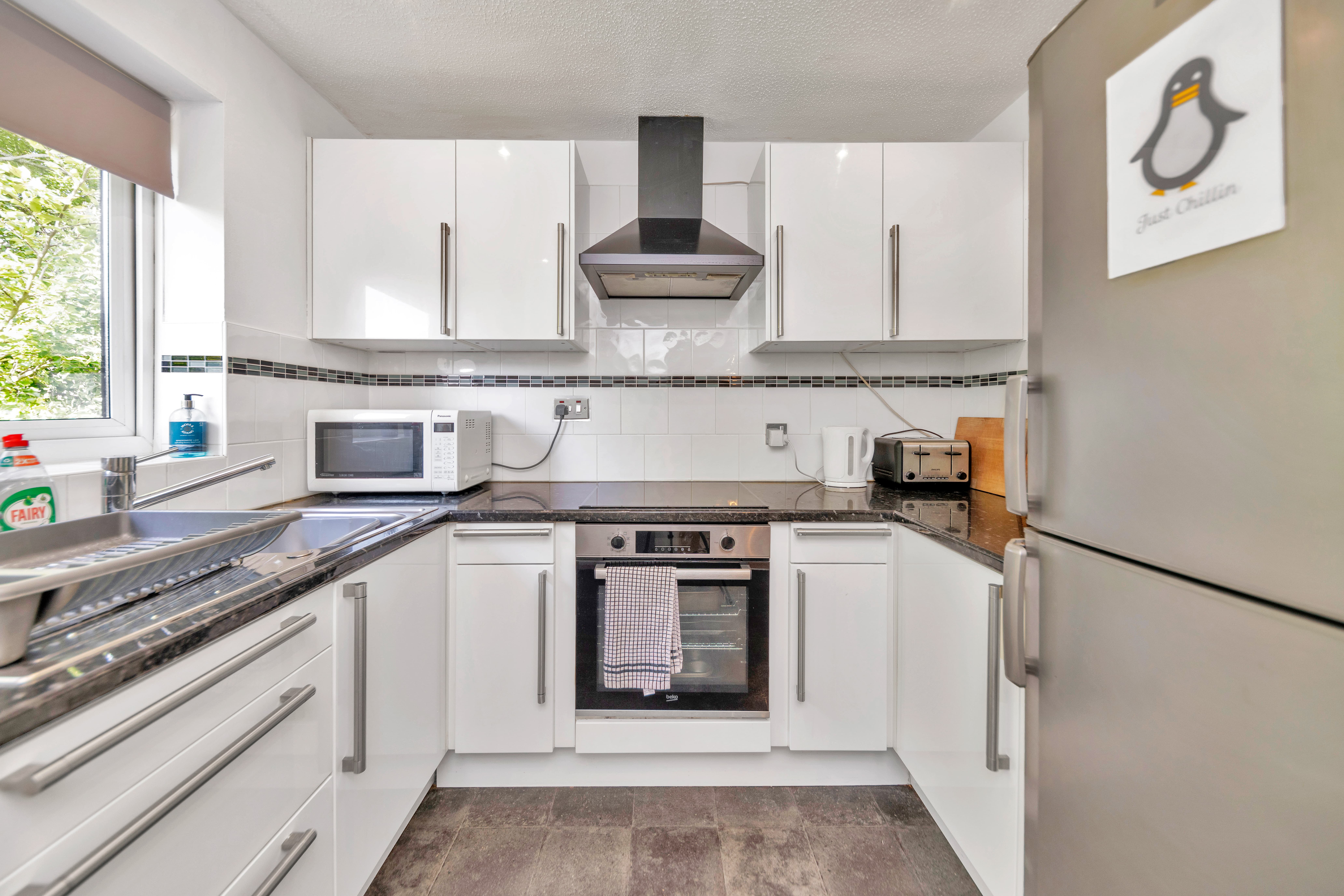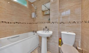 The kitchen is a very good size, enjoying a large window, a range of base and wall units, laminate worktops, tiled flooring and splashbacks, inset lighting, integrated storage, an integrated oven, hob and extractor hood, and space for a fridge/freezer, washing machine and other small kitchen appliances.
