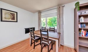 The lounge/dining room is a generous space, benefiting from a large window, wood flooring, pendant lighting, and ample room for a variety of lounge, dining and storage furniture.