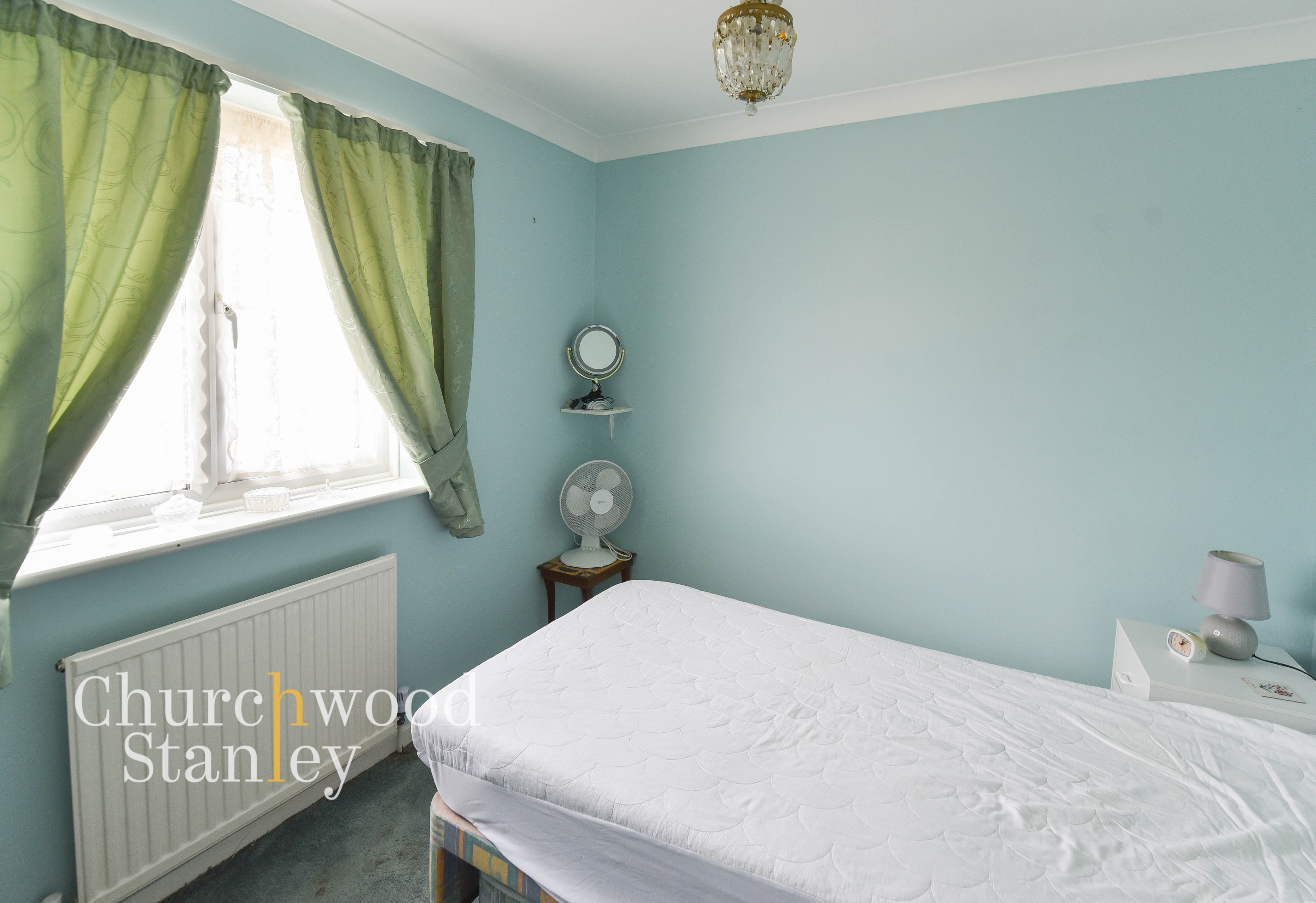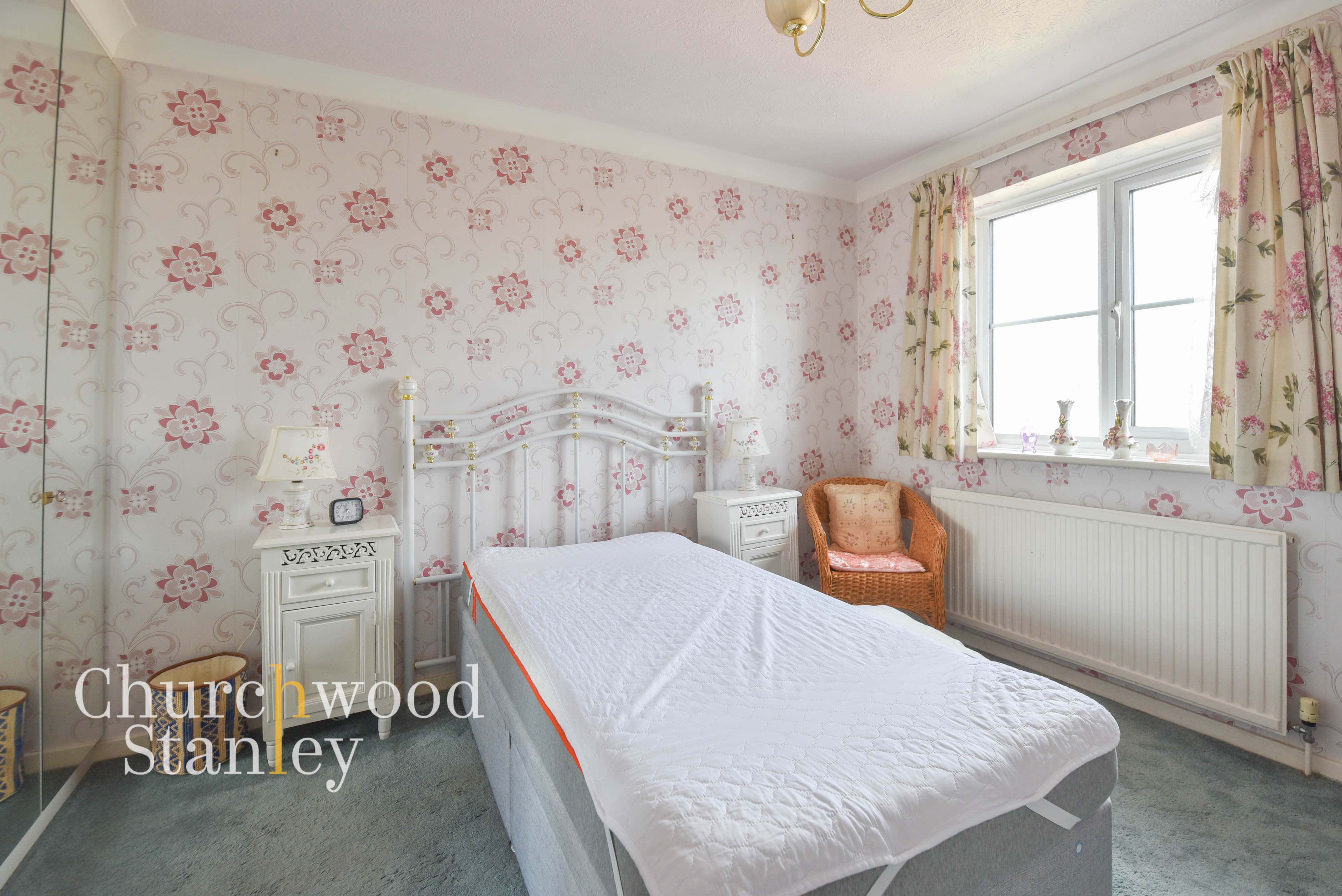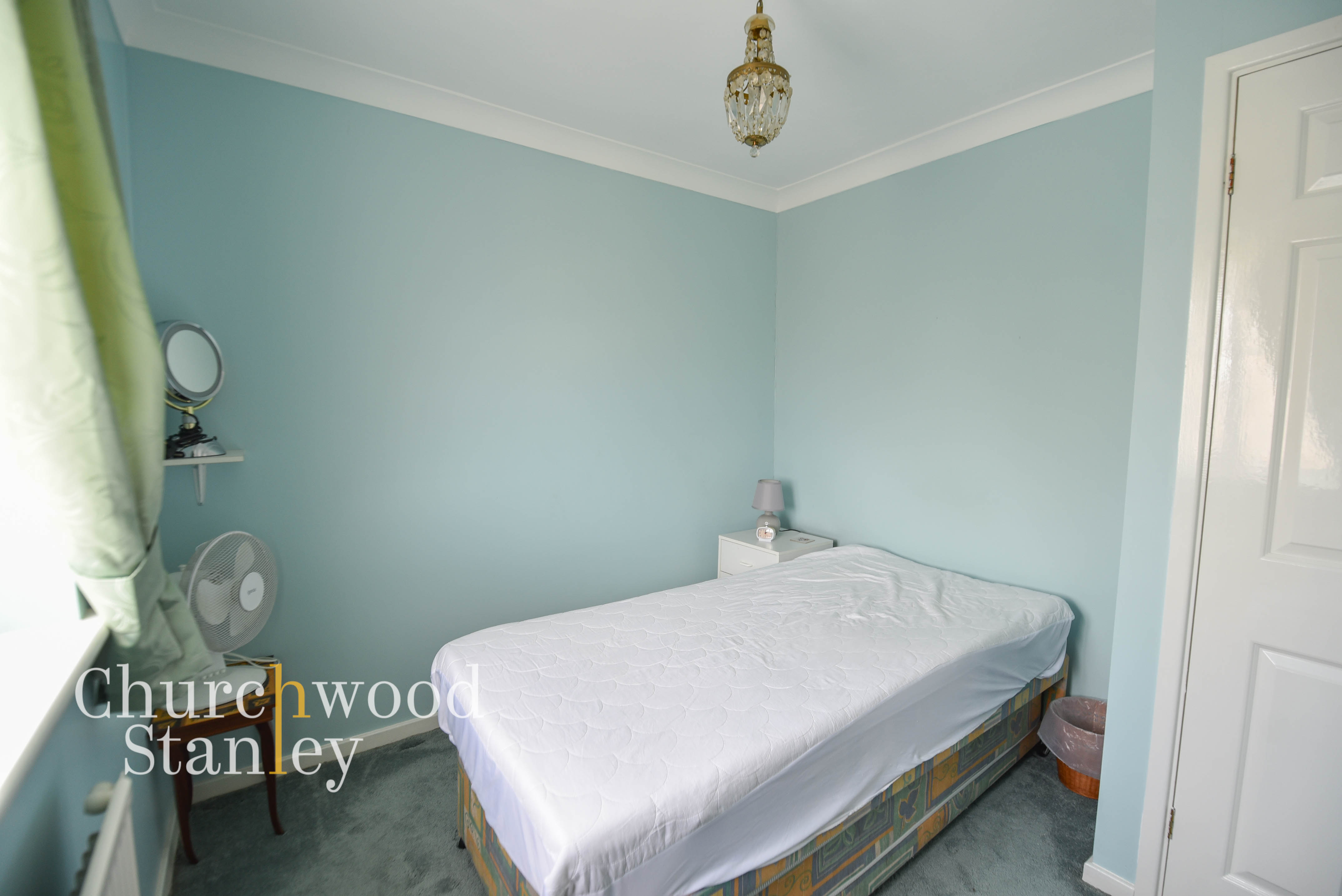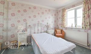 Positioned to the rear of the house, the main bedroom is a well-proportioned double that takes full advantage of the elevated setting. A large window draws in natural light while also framing far-reaching views across the surrounding rooftops and out towards the Stour estuary and the Suffolk landscape beyond. The room comfortably accommodates a double bed alongside bedside furniture, with fitted wardrobes running along one wall providing built-in storage without reducing the usable floor space. The layout is simple and effective, allowing for easy arrangement. The outlook is a defining feature here, offering a sense of distance and openness that is not often found in homes of this type or price point.