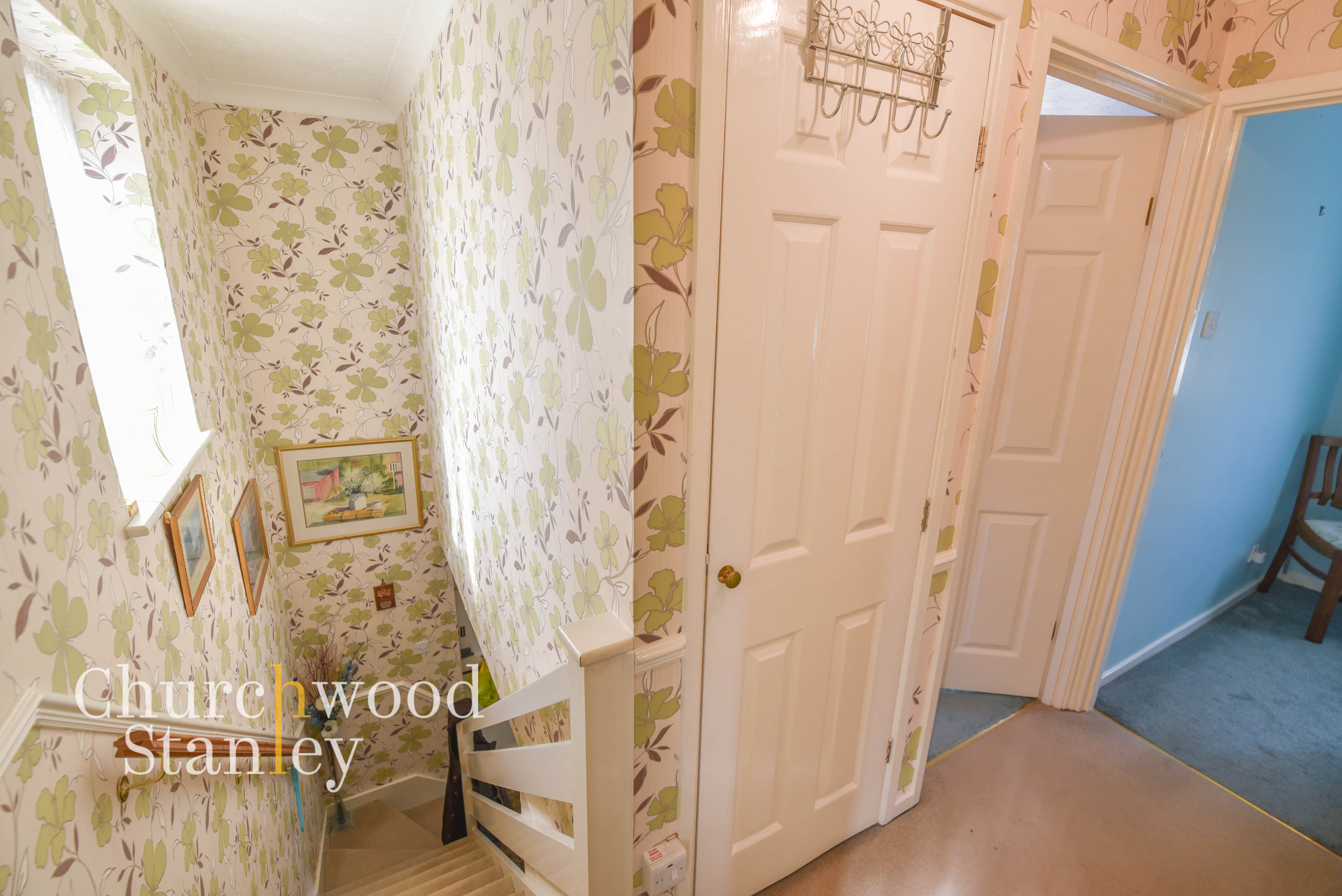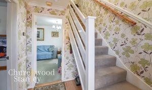 The landing provides access to both bedrooms and the bathroom, arranged in a straightforward and functional layout. A window to the side brings in natural light, helping to keep the space bright despite its central position within the house. There is a built-in airing cupboard offering useful storage, along with access to the loft above. The staircase rises neatly from the hallway below, with continuation of the balustrade maintaining a consistent feel between floors.
