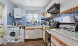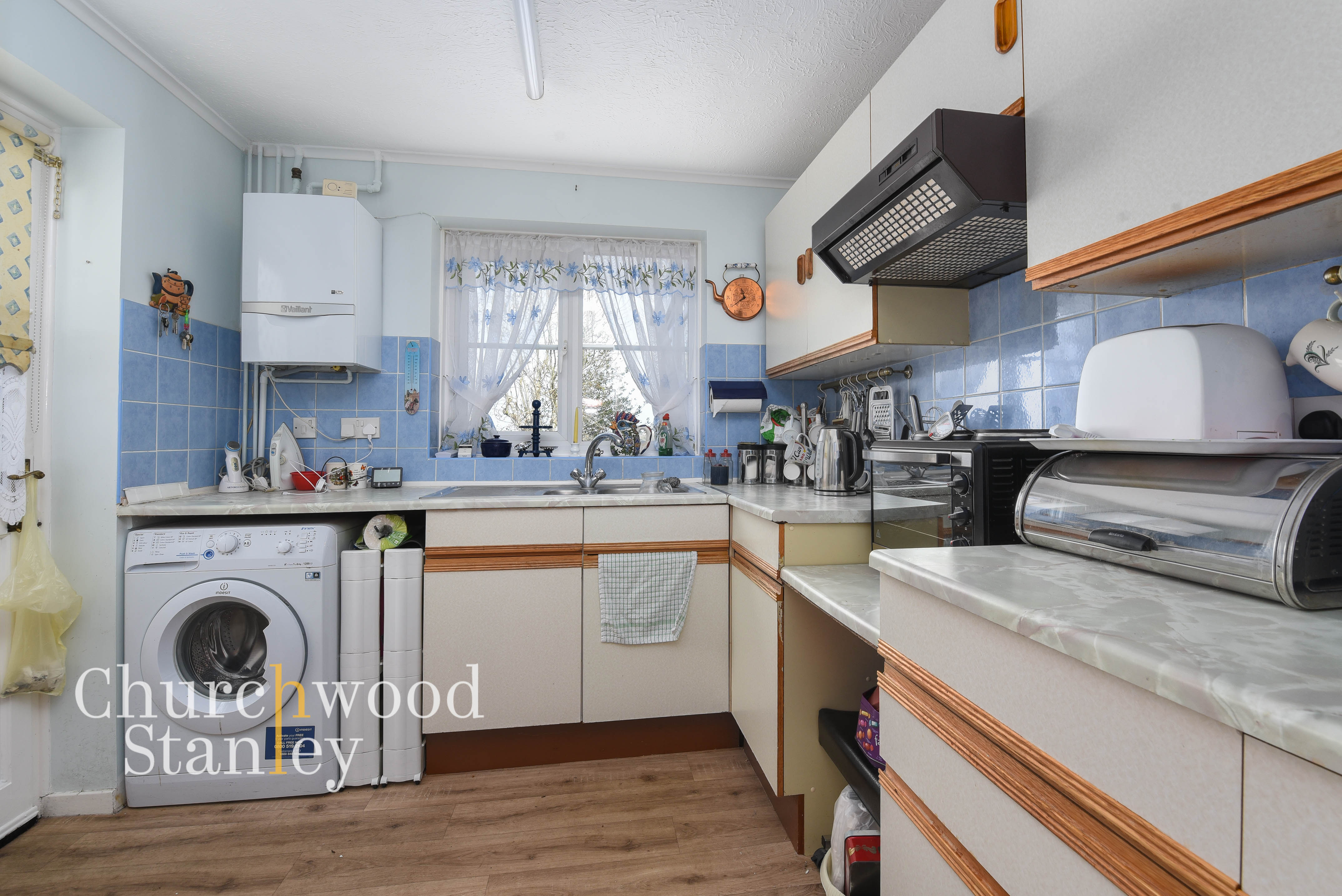 Set to the rear of the house, the kitchen is arranged in a practical L-shaped layout that makes sensible use of the space available. Work surfaces run around the main preparation and sink area, with additional surface space to the side, helping the room function well for everyday cooking without feeling overcomplicated. Storage is provided by a combination of base and wall units, while there is space for freestanding appliances including a washing machine and cooker beneath the extractor hood. A window over the sink draws in natural light and looks out to the rear, while the door to the side provides direct access into the garden, which is useful both practically and for day-to-day flow through the house. A modern wall-mounted boiler is also fitted here, giving an added point of reassurance. The room is functional as it stands and offers straightforward scope for cosmetic updating in time, depending on a buyer’s taste.