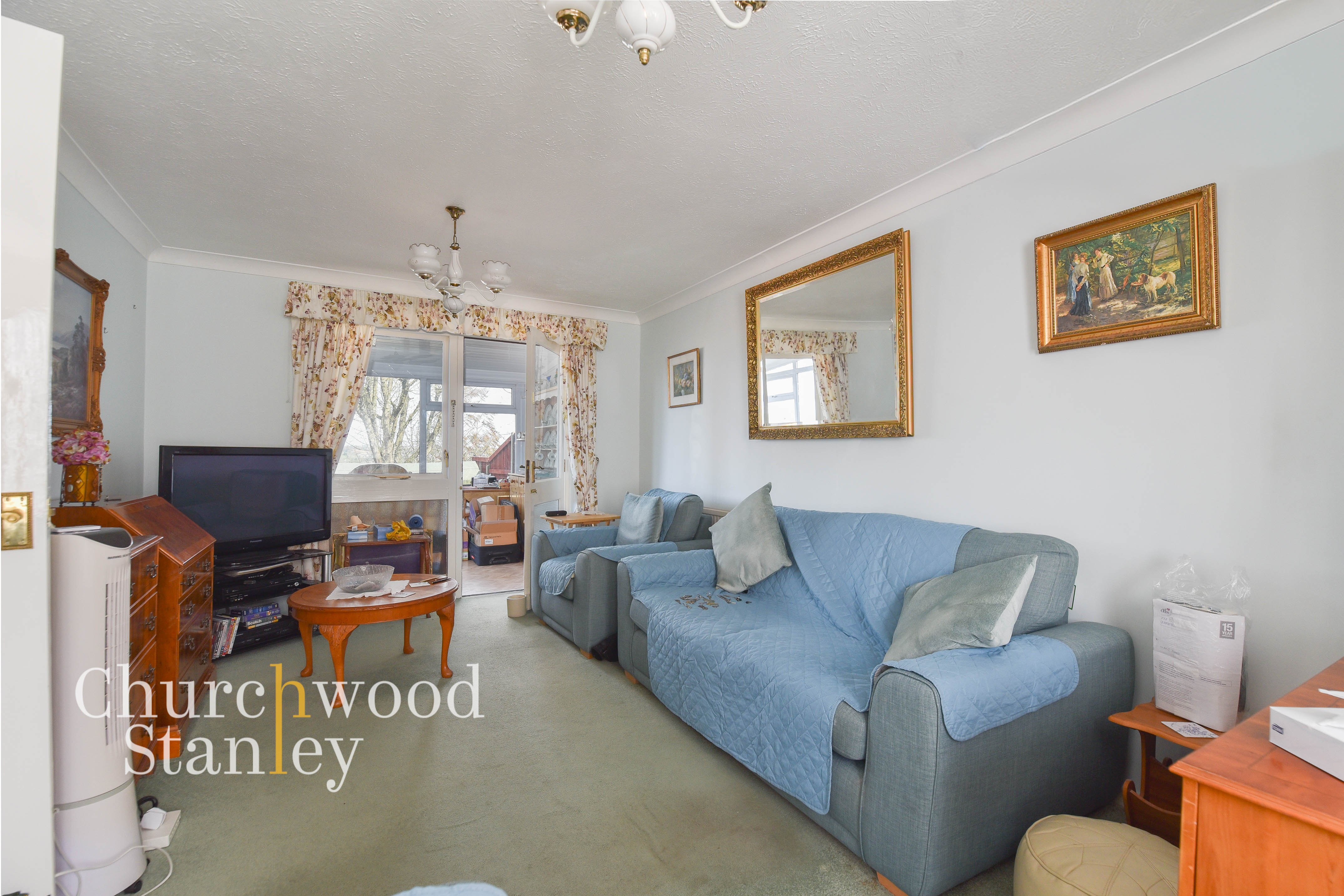 Running the depth of the house, the living room is arranged as a long, continuous space that naturally separates into distinct areas without the need for structural division. The main seating area sits centrally, with enough width for sofas and media, while still allowing clear movement through the room. To the rear, the space opens out towards the conservatory, with glazed double doors drawing in additional light and extending the overall feel of the room. This creates a natural second zone that could be used for dining, reading, or a quieter seating area, depending on how a buyer chooses to arrange it. At the opposite end, a box bay front-facing window provides further natural light, giving the room a balanced aspect from both directions. The proportions work well for everyday living, offering flexibility in how the space is used without feeling compromised by its shape.