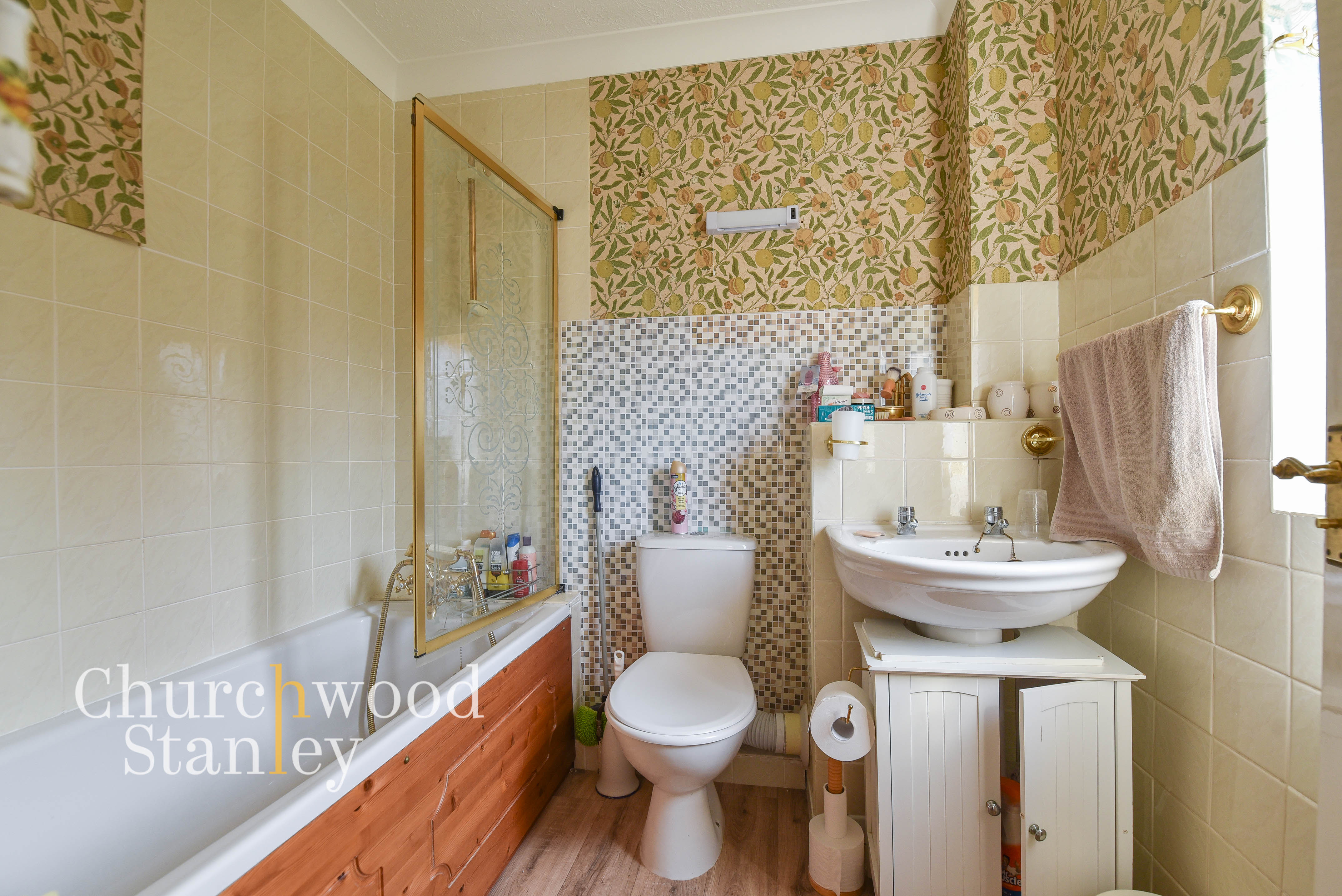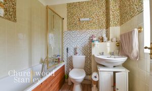 Fitted with a three-piece suite comprising a panelled bath with shower over and glass screen, wash basin and WC, the bathroom is arranged in a practical layout that makes efficient use of the space available. Tiling runs around the bath and splashback areas, with a window providing natural light and ventilation, helping to keep the room bright. The proportions work well for everyday use, with space to move comfortably without feeling restricted. The room is absolutely functional as it stands, with scope for updating over time if desired.