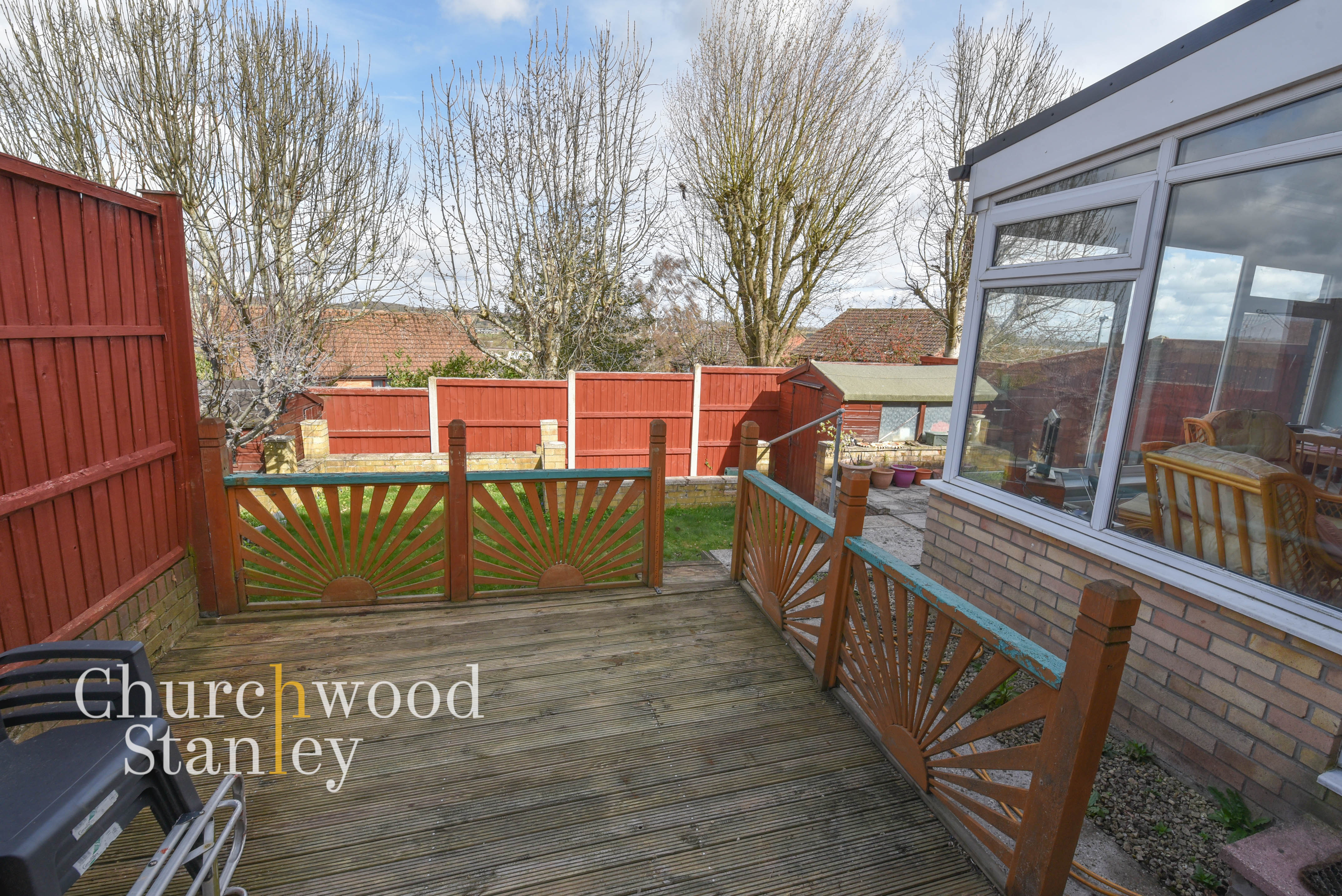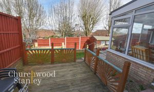 To the rear, the garden is arranged across split levels, creating distinct areas that naturally separate seating and lawn space. A raised decked terrace sits directly off the conservatory, providing an elevated position for outdoor seating and making it an easy extension of the internal living space. Steps lead down to a lawned section, bordered by fencing and planting, with additional patio space positioned to one side. The layout is practical and manageable, offering usable outdoor space without excessive maintenance. As with the house itself, the elevated position is noticeable here, with a more open outlook beyond the immediate boundary and glimpses towards the wider landscape.