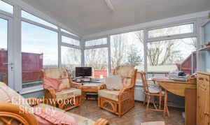 Positioned to the rear, the conservatory provides a natural extension to the main living space, adding a second reception area that is noticeably brighter and more open. Surrounded by glazing on three sides and finished with an insulated roof, the room is usable across the seasons rather than feeling purely transitional. There is enough floor space here to comfortably accommodate seating or a small dining arrangement, making it a versatile addition depending on how it is used. A door connects back through to the living room, allowing the two spaces to work together when opened up. From here, there are outward views beyond the immediate garden, with the elevated position of the house allowing for distant outlooks that add a sense of openness not always found in similar homes. A door provides direct access outside, reinforcing the connection to the garden.