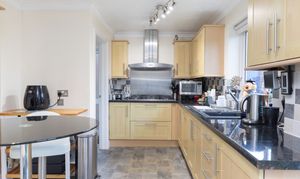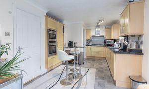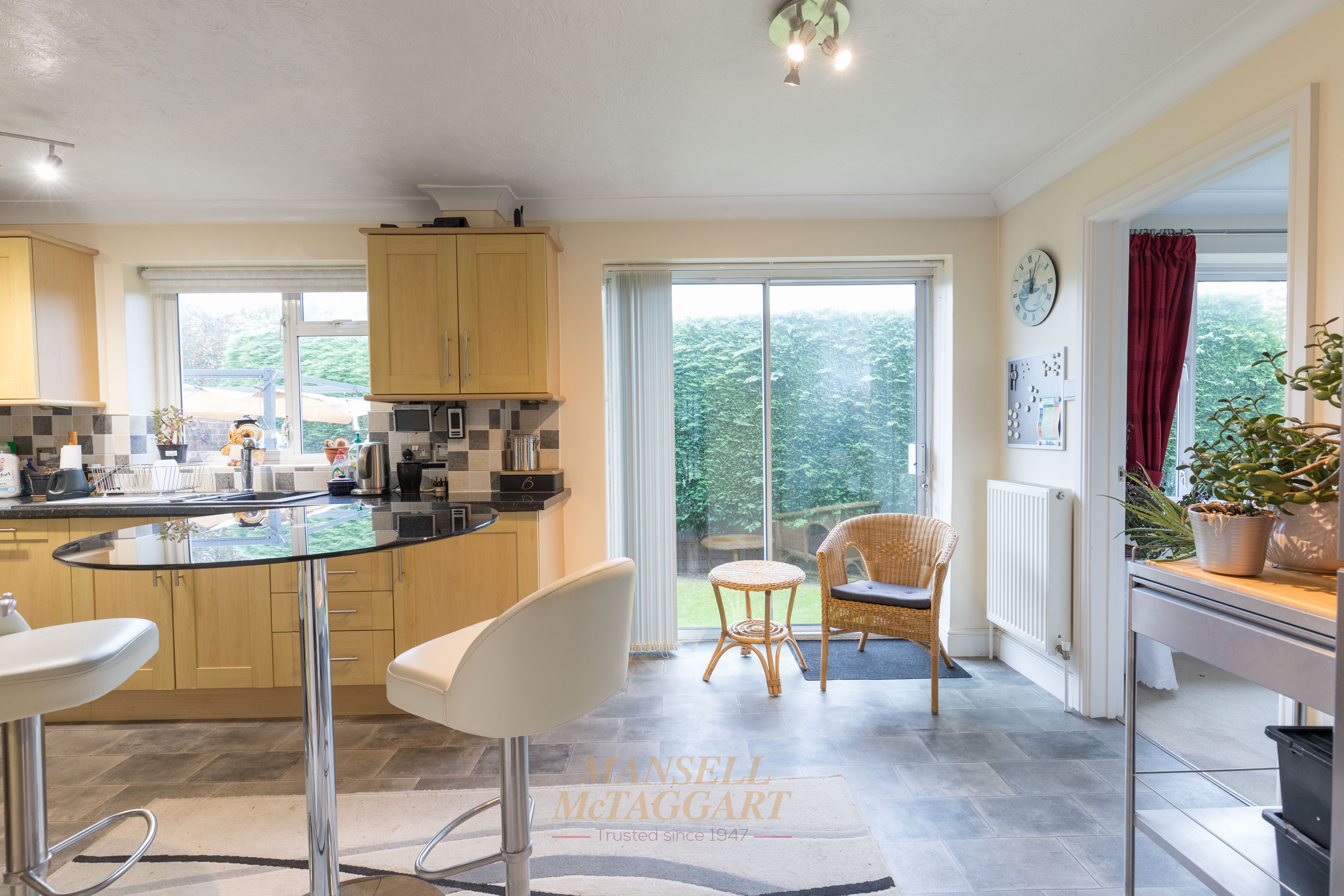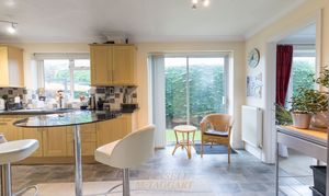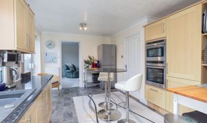 The kitchen/breakfast room spans the rear of the house, with patio doors opening directly onto the south-facing garden, perfect for family dining and entertaining. The kitchen is fitted with an extensive range of wall and base units, complemented by ample work surfaces. Integrated appliances include a gas hob, electric oven, washing machine, dishwasher, space for fridge/freezer, making this a highly functional and sociable space. A rear lobby provides additional garden access, coat hanging space, and leads to a well-appointed downstairs cloakroom.