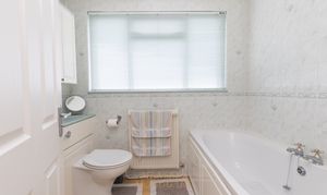 Upstairs, the first-floor landing provides access to three spacious bedrooms, some of which feature fitted wardrobes, all of which can comfortably accommodate double beds and freestanding furniture with the master bedroom benefitting from an en-suite. The family bathroom is tastefully equipped with a panel bath featuring a shower over and screen, a wash basin, a low-level WC, functional fitted storage, and recessed spotlights, all finished with tiled walls.