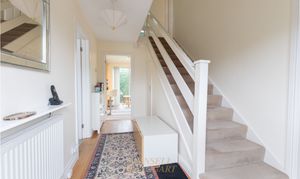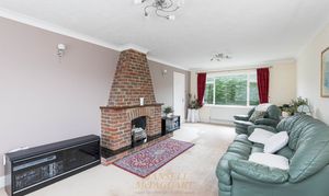 A welcoming entrance porch with exterior lighting and glazed front door opens into a bright and airy hallway, where there is ample space for coats and shoes, along with a useful under-stairs storage cupboard. From here, doors lead to the main reception spaces. To the front of the property is a versatile dining room, equally suitable as a fourth bedroom or study, while the generously proportioned triple-aspect living room is flooded with natural light and features a charming brick fireplace with tiled insert, creating a warm and inviting focal point.