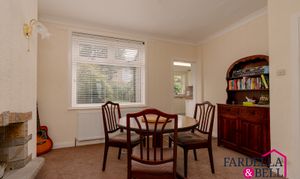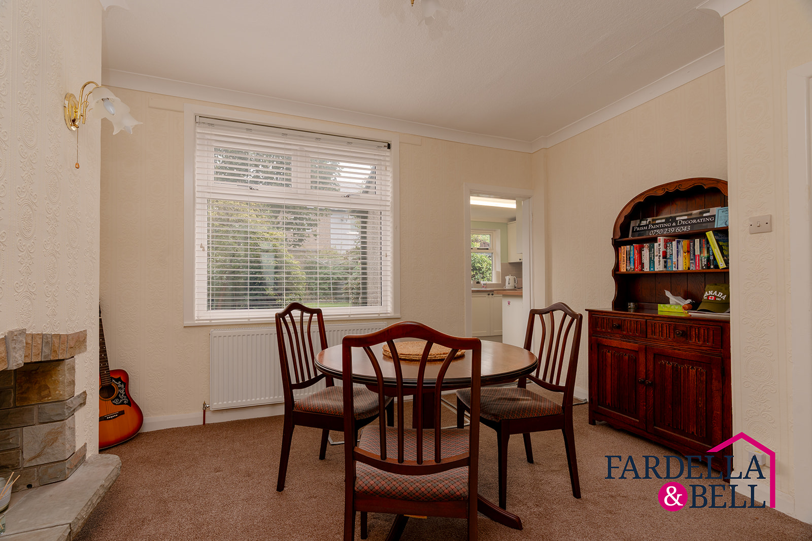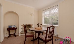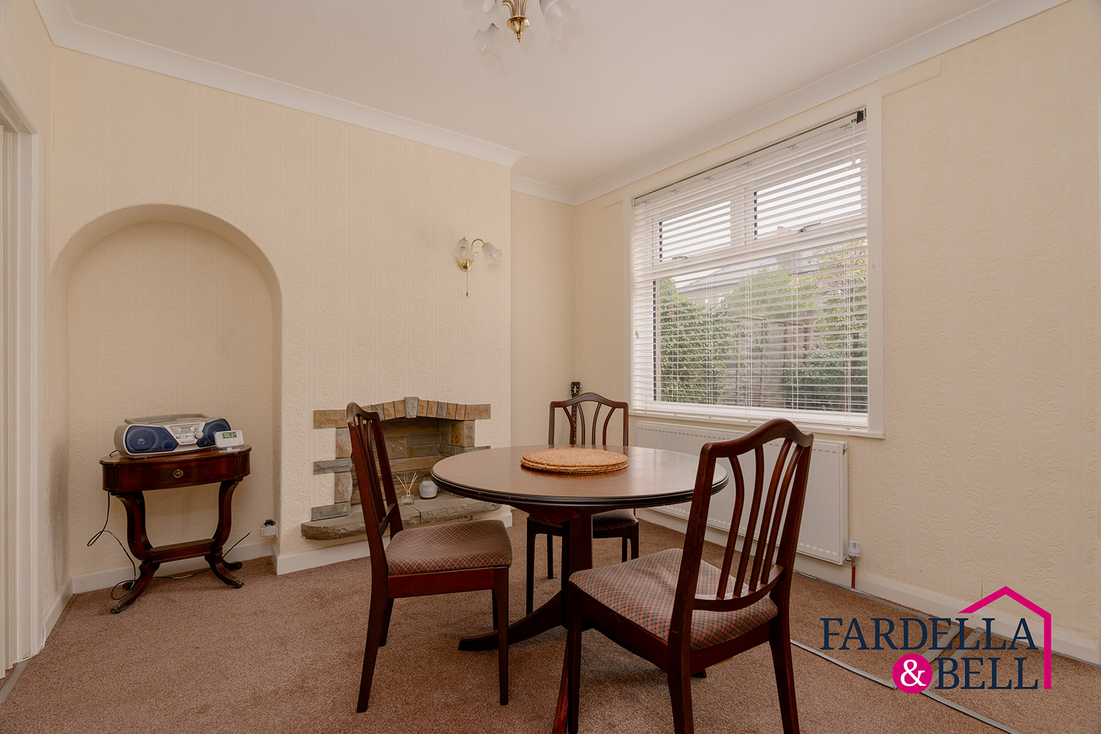 This well-proportioned dining room benefits from generous natural light, UPVC double glazed window, large radiator, classic architectural details, and a charming alcove feature that adds character to the space.