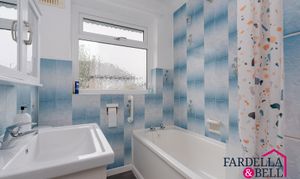 The bathroom is well-appointed with classic blue and white tiling, a frosted window for privacy, a bath with twin taps, a vanity sink, a push button toilet and a clean, functional layout.
