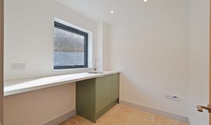 A utility room is to the side of the entrance hallway, with plumbing for white goods and inset sink with tap over.