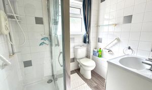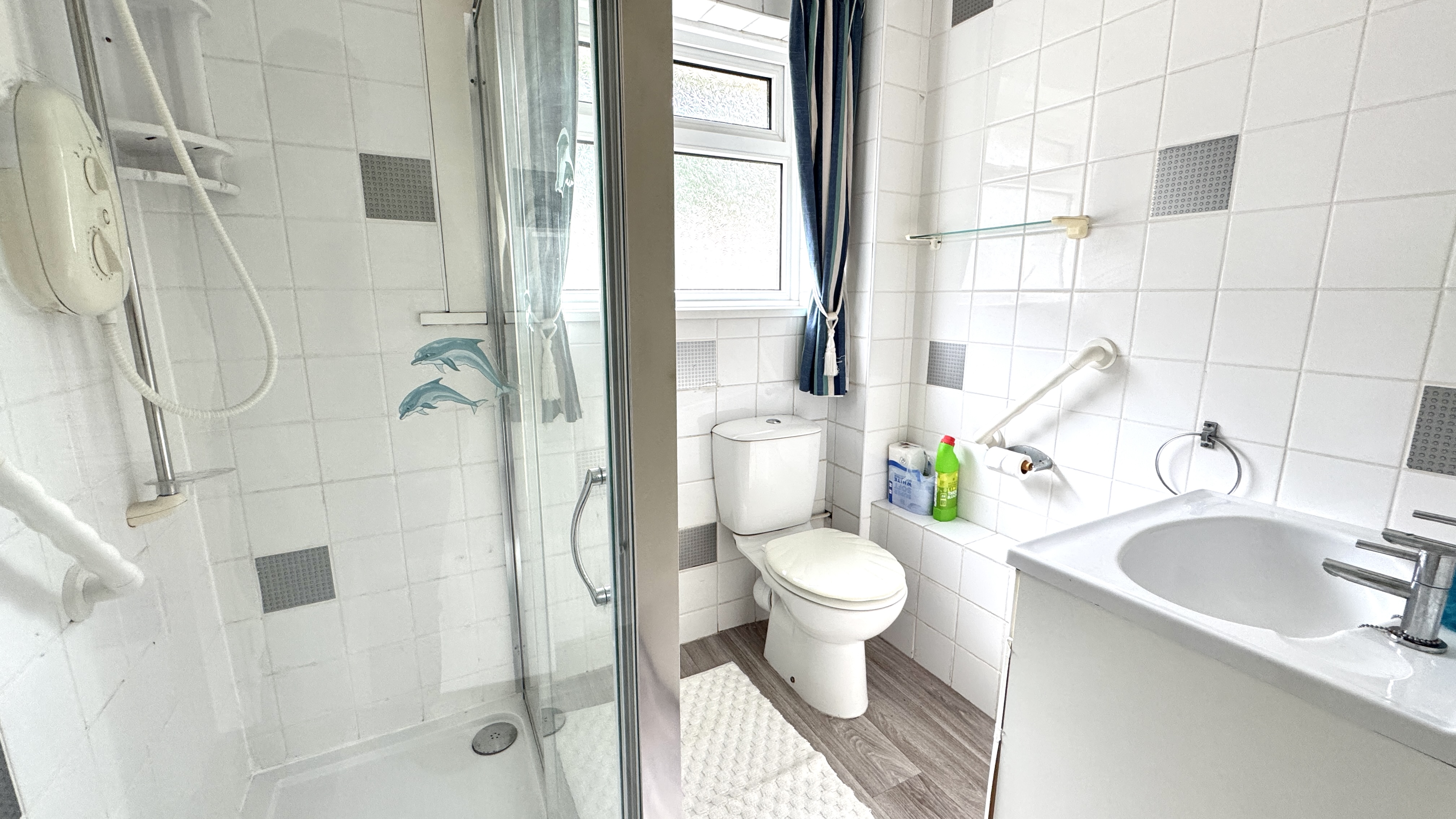 The bathroom is finished with a contemporary double shower cubicle with an electric shower, a low-level WC, and a wash hand vanity unit. An airing cupboard, housing the boiler, adds further convenience and storage.