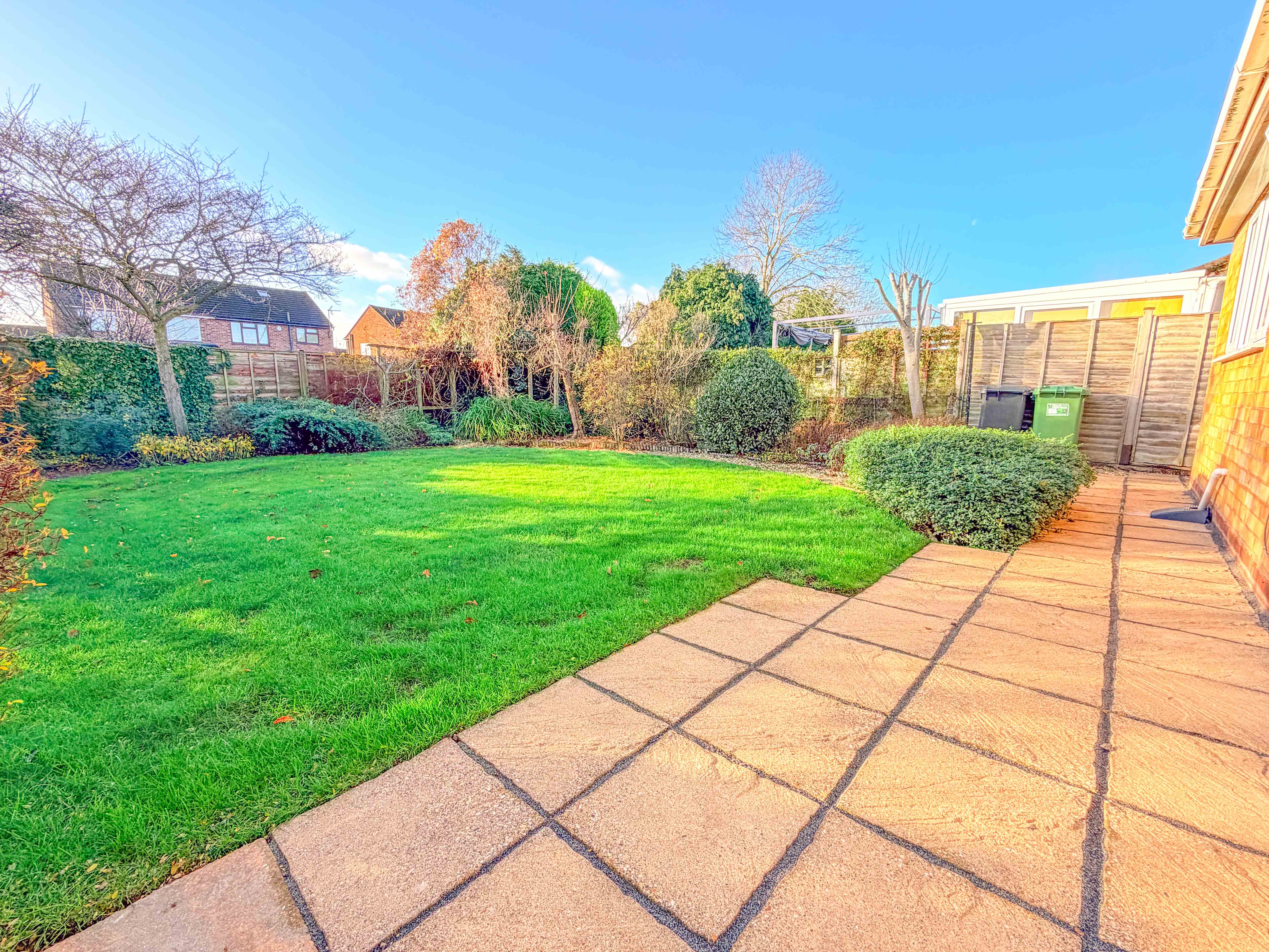 The rear garden presents a charming outdoor haven, thoughtfully landscaped to include a generous paved patio—perfect for outdoor seating and dining—leading onto a neat lawn with well-tended borders. The garden is fully fenced, ensuring privacy and a sense of seclusion.