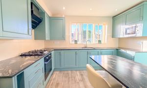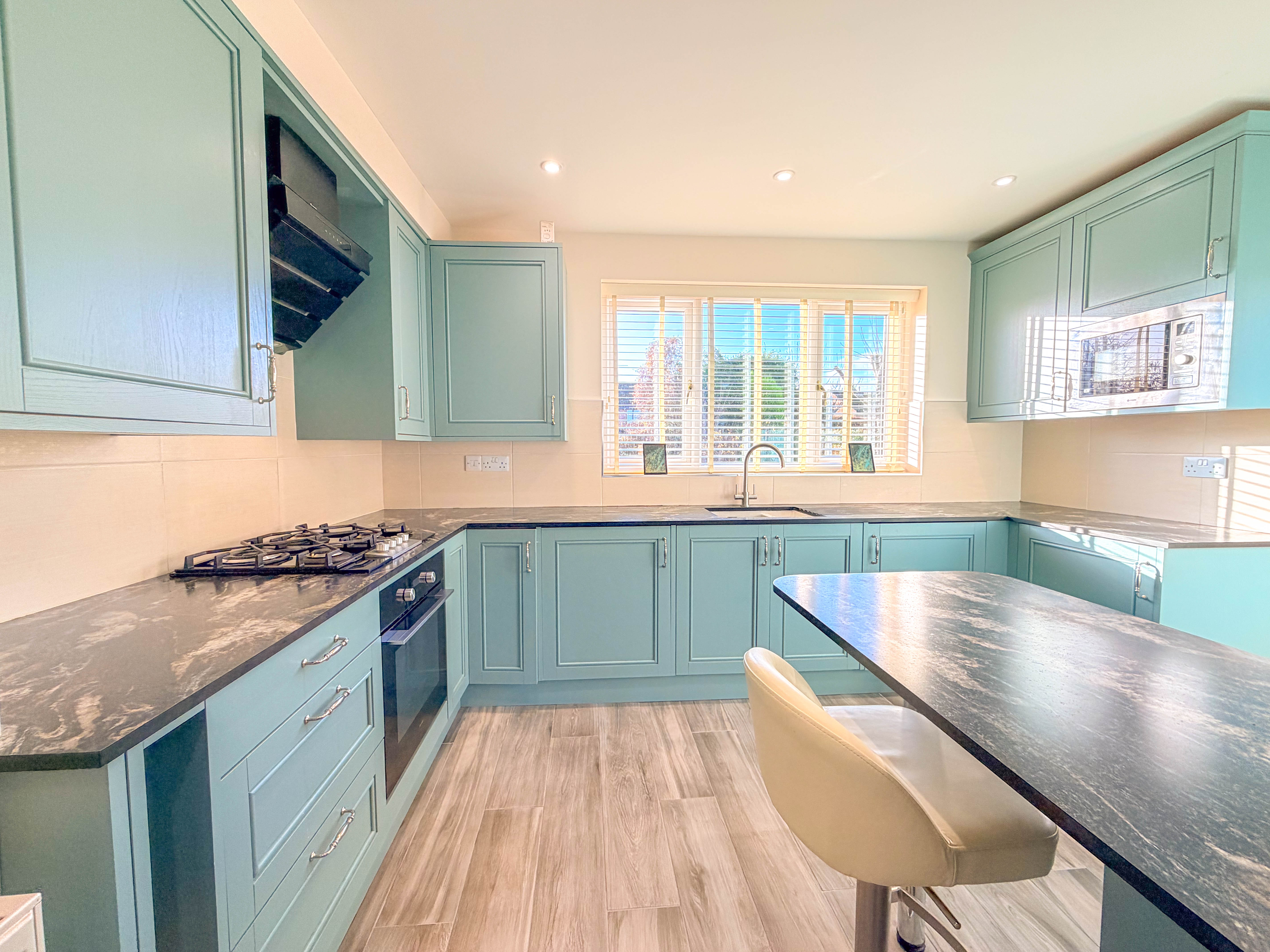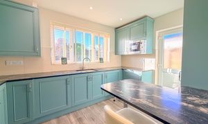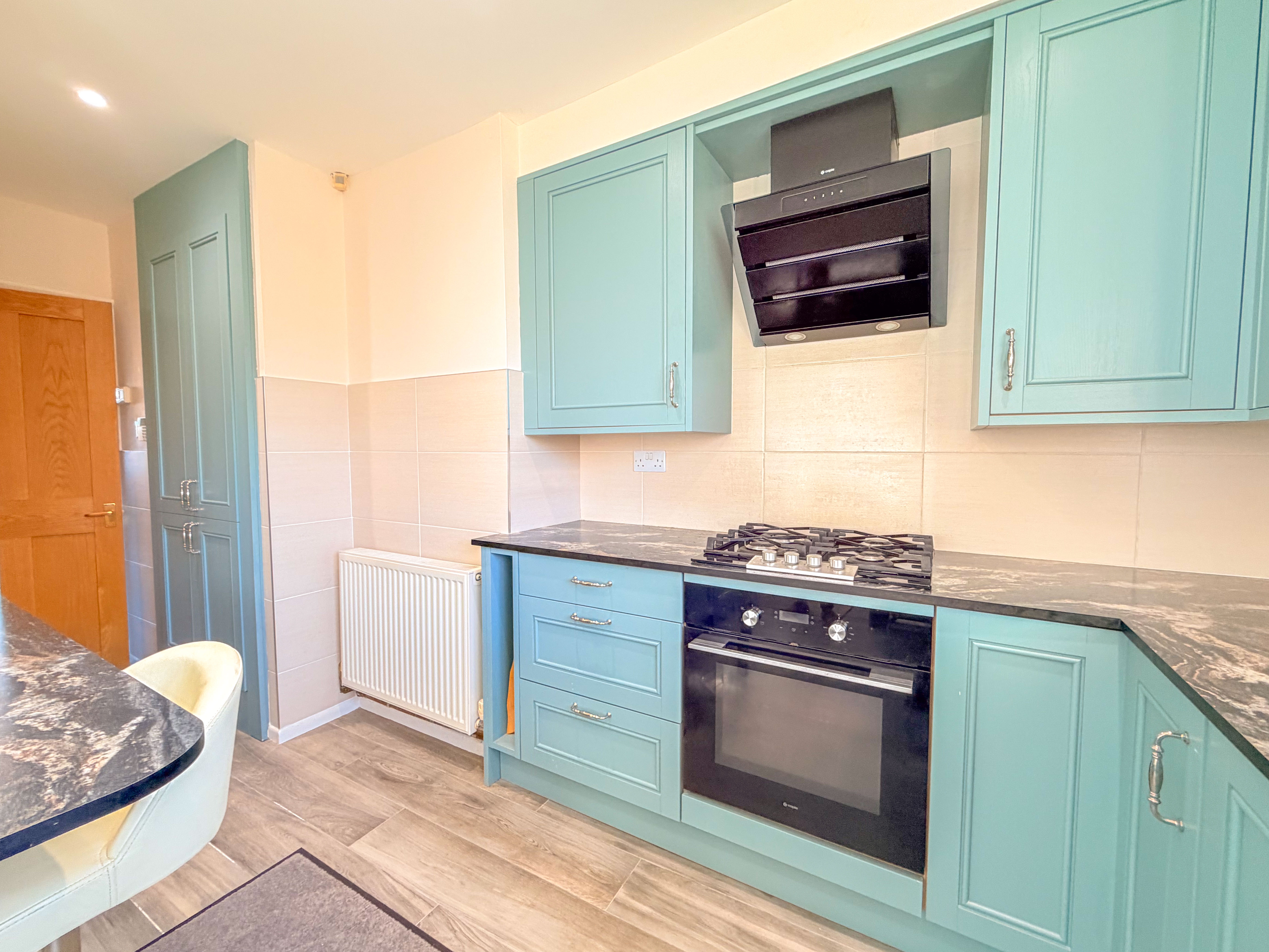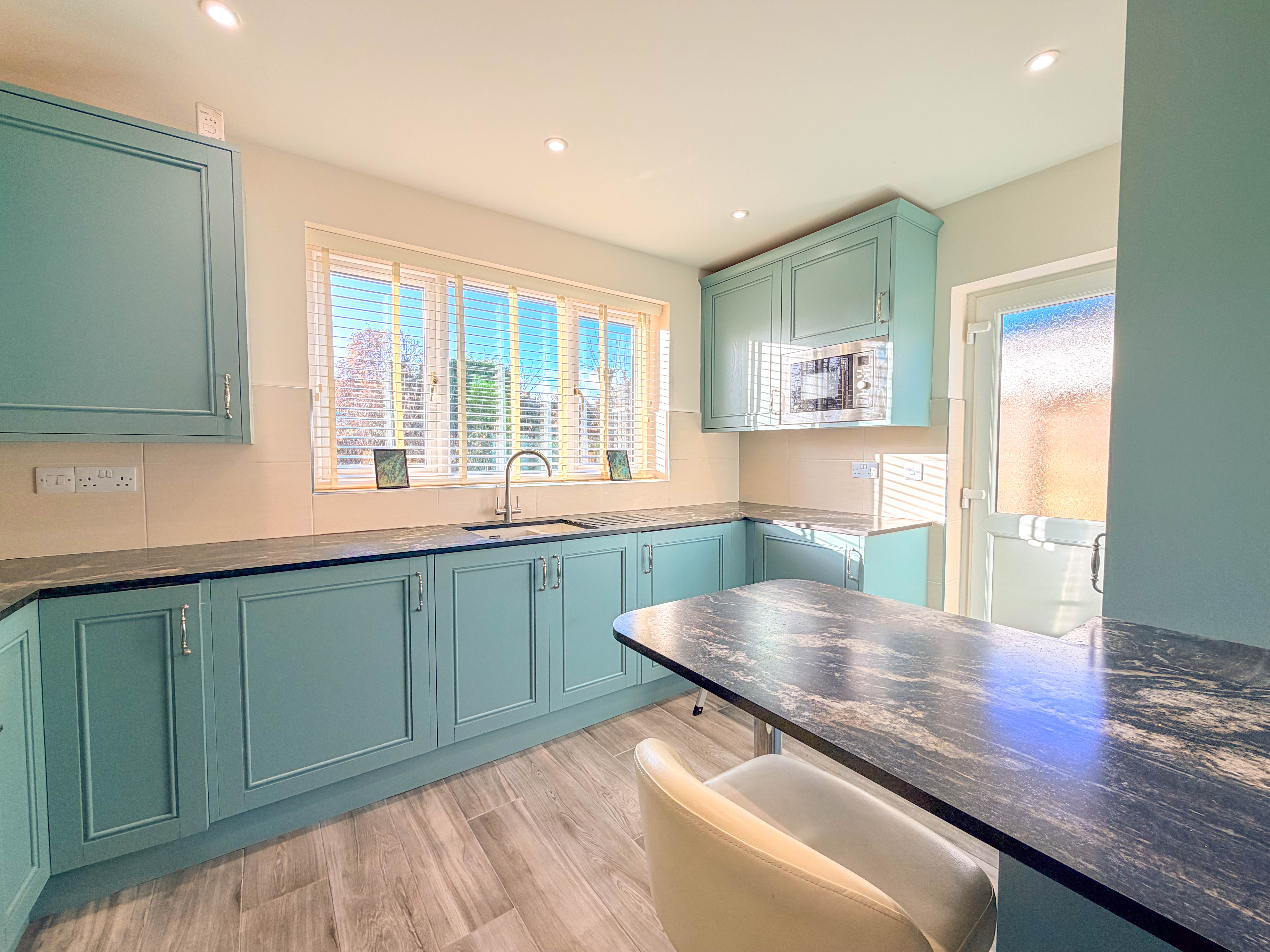 The recently refitted kitchen is accessed from the hall and offers a stylish and well-planned arrangement of units paired with contrasting work surfaces, combining modern aesthetics with everyday practicality.