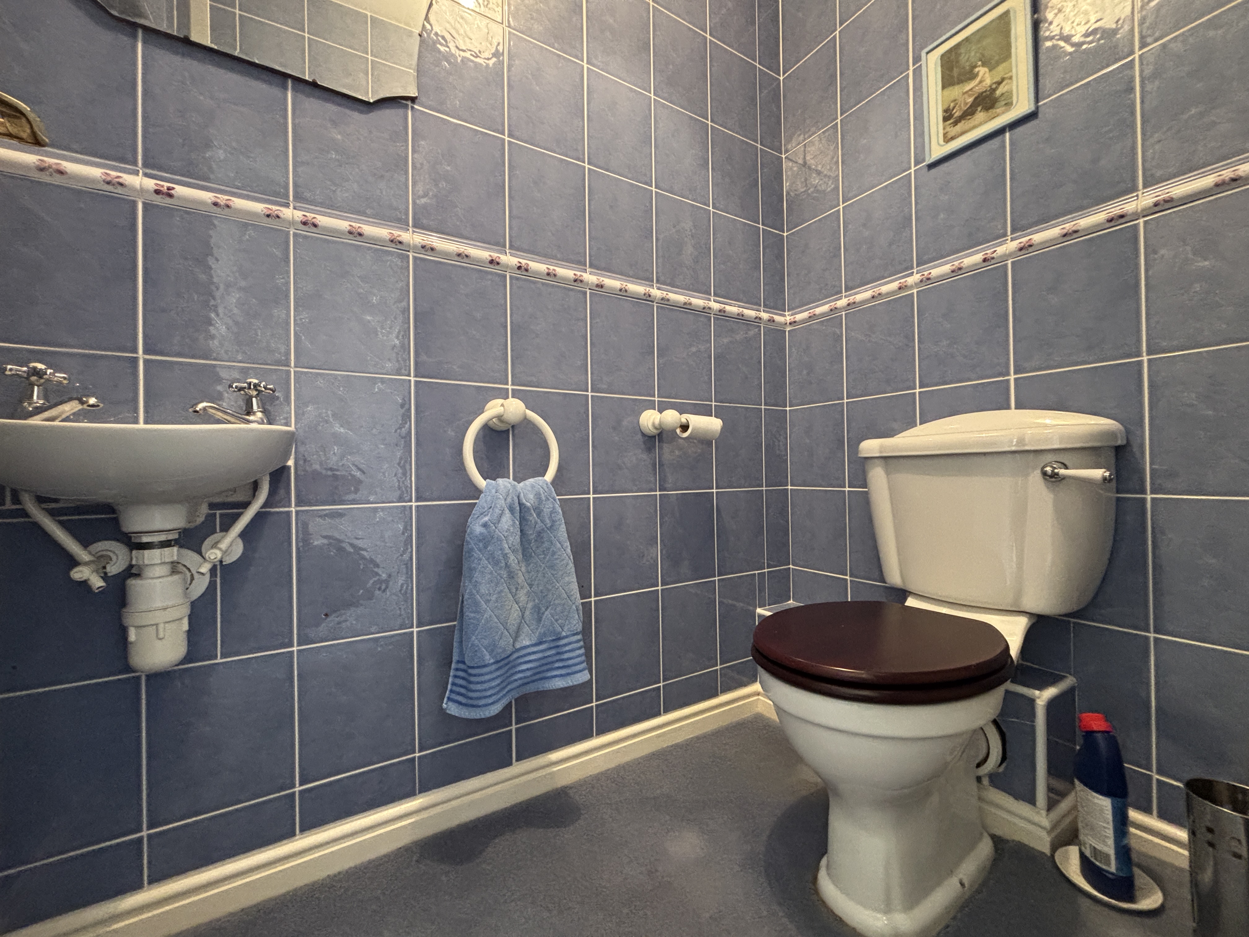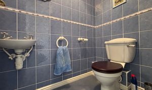 Carpeted, fully tiled walls and a smooth ceiling. A two piece white suite comprising a wall mounted wash basin with stainless steel pillar taps and a close coupled WC. Radiator.