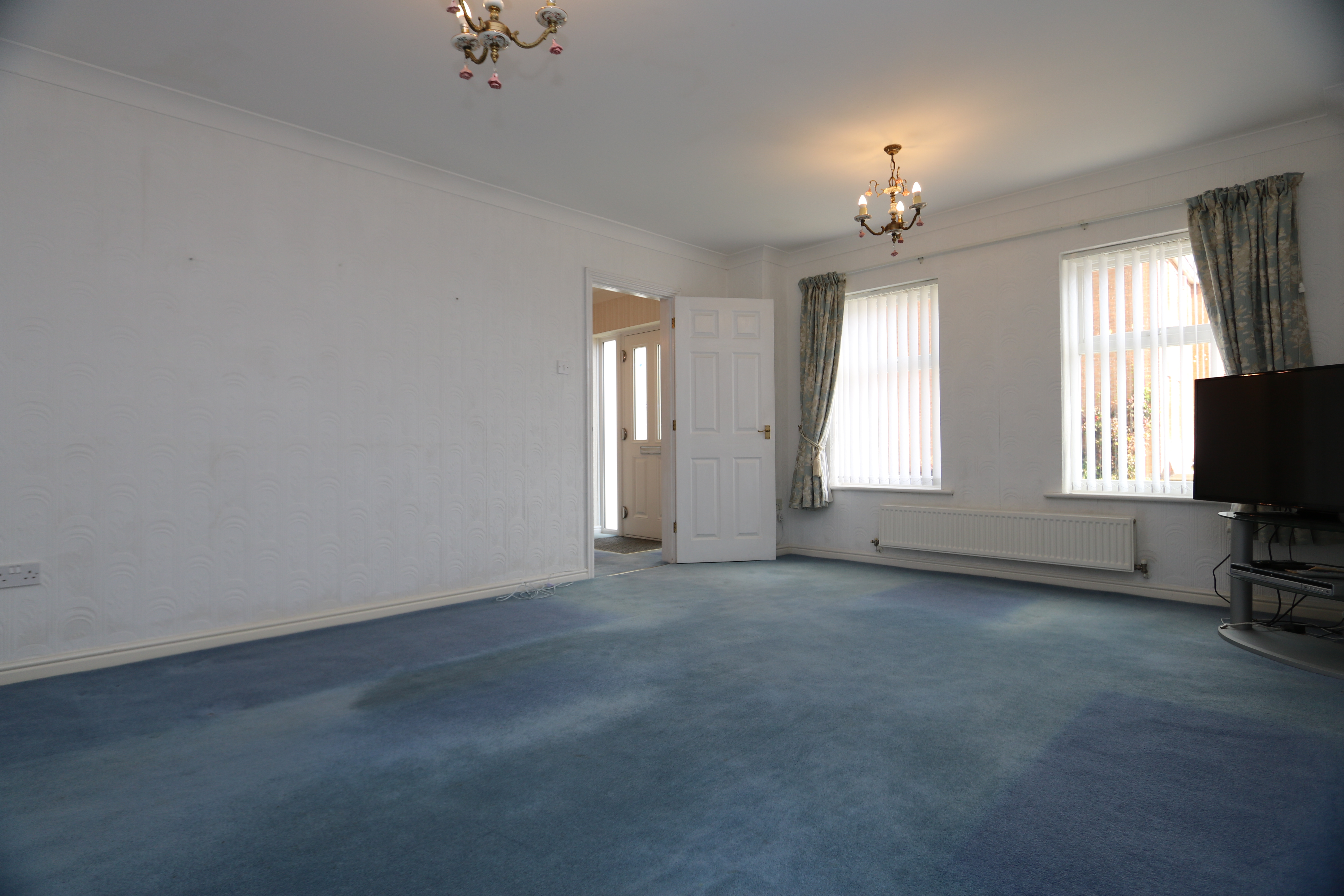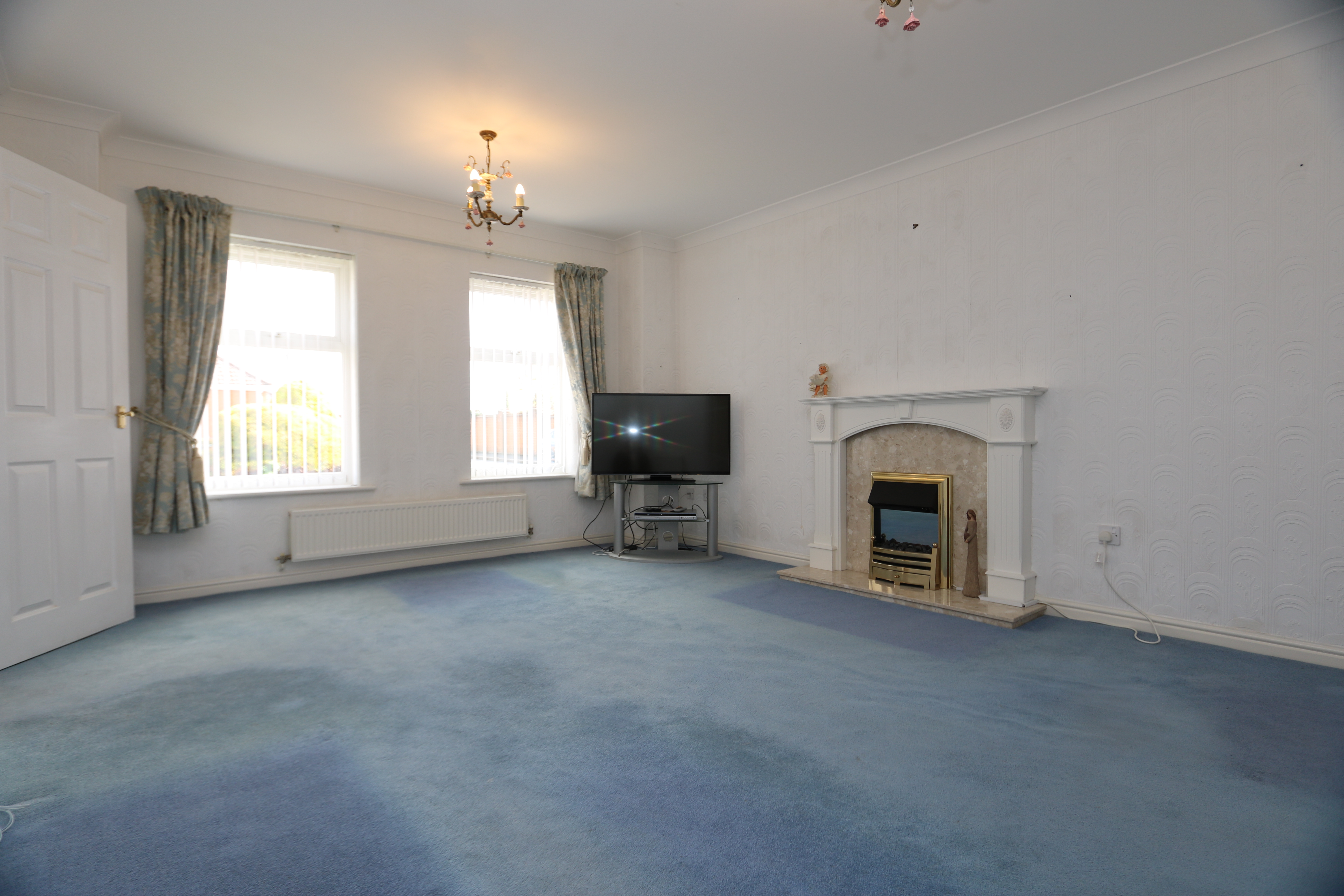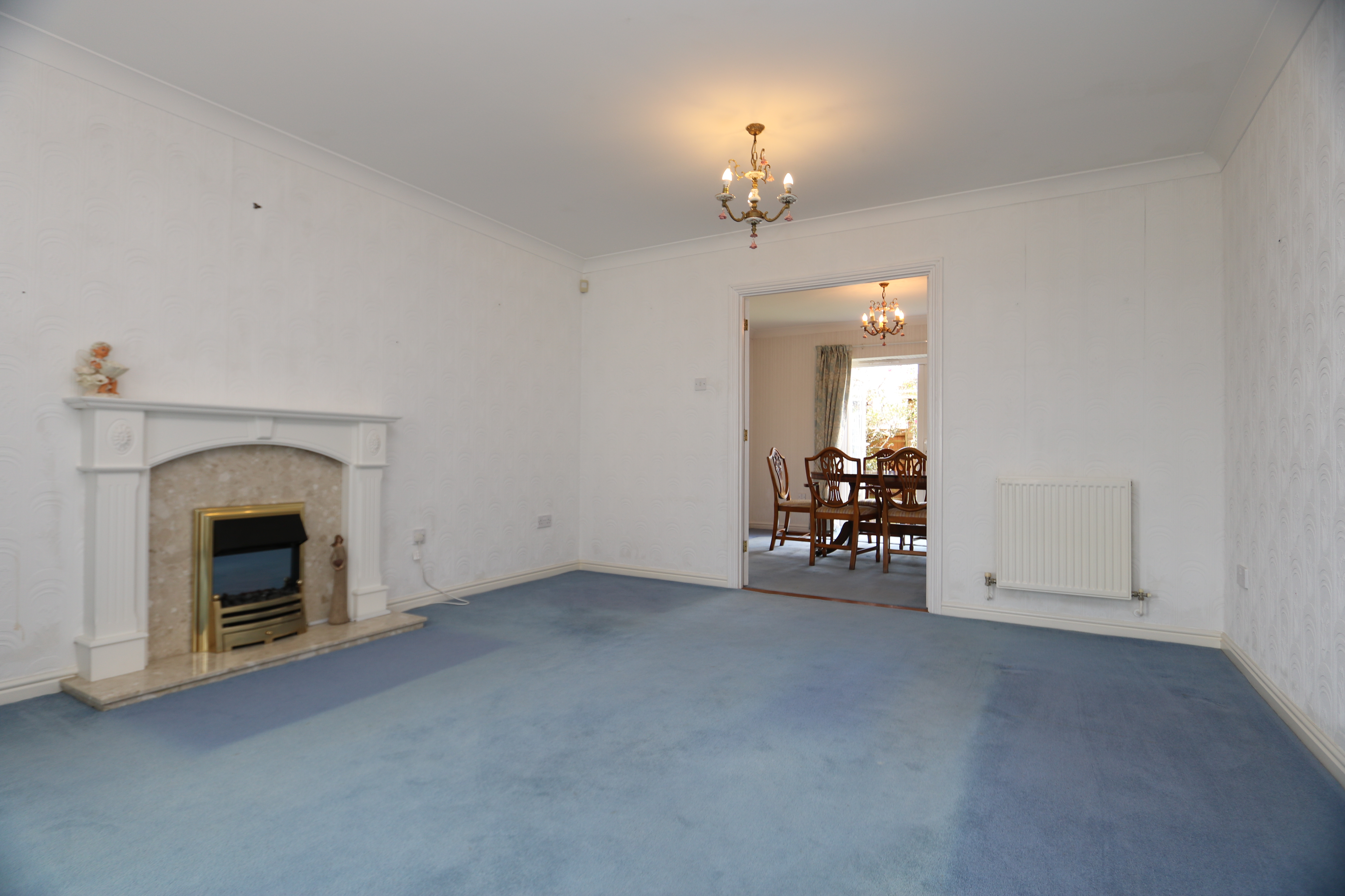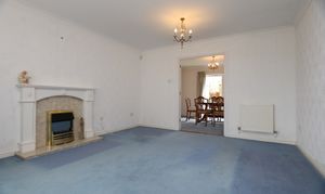 Carpeted with wallpapered walls and a smooth coved ceiling. Two front aspect windows, two radiators, a feature fireplace with a wooden mantel and double opening doors that lead through into the dining room.