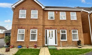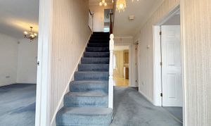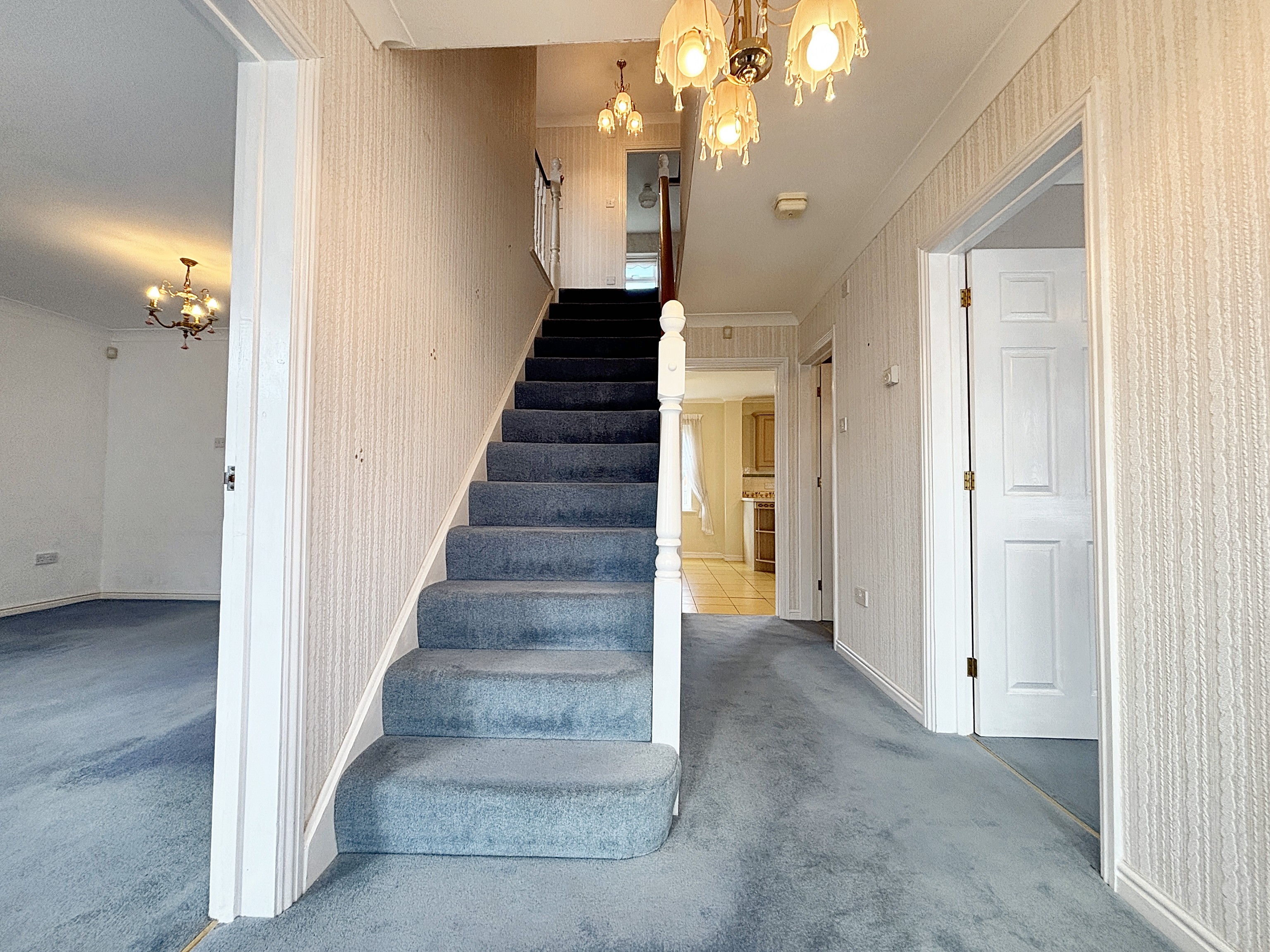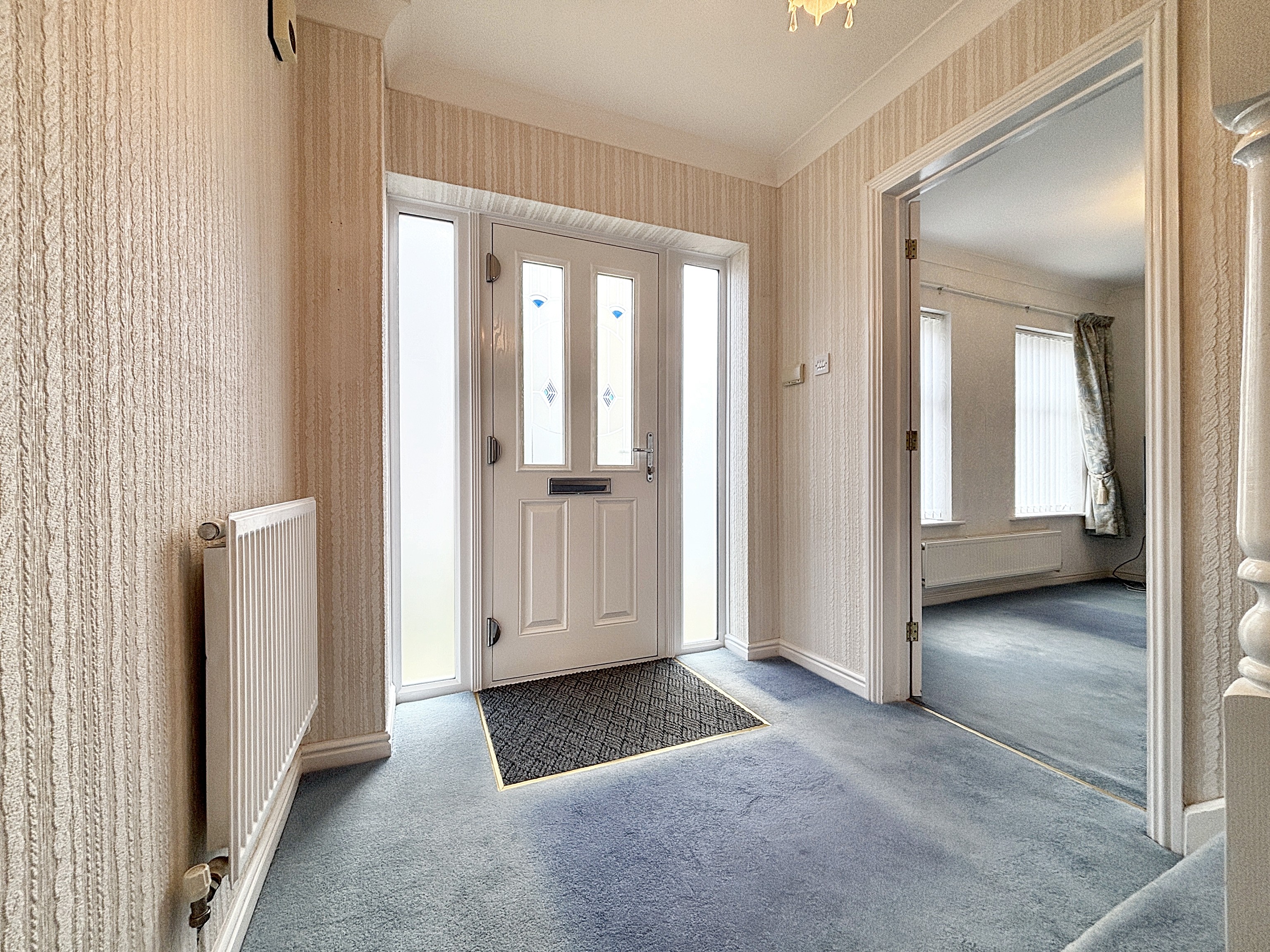 Entrance via a uPVC front door with opaque stained glass panels and matching opaque panels either side. The hallway is carpeted with wallpapered walls, a smooth coved ceiling and a radiator. There are doors leading off to the lounge, kitchen, WC/cloakroom and study. A carpeted staircase with a wooden balustrade leads to the first floor.