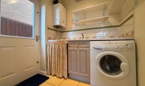 A continuation of the tiled flooring from the kitchen, smooth walls and a smooth ceiling. Wooden base level units with a complementing worktop (matching the kitchen). A stainless steel sink inset with a stainless steel mixer tap overtop. Space and plumbing for a washing machine. A tiled splashback and a radiator. A uPVC door with opaque glazing leading out to the garden. Boiler.