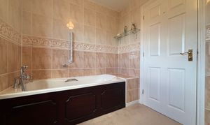Carpeted with fully tiled walls and a smooth ceiling. An opaque rear aspect window and a radiator. A four piece white suite comprising a close coupled WC, a pedestal wash basin with stainless steel pillar taps, a bath with a stainless steel mixer tap and rinser and a walk in shower with a stainless steel thermostatic shower inset and a glass shower screen.