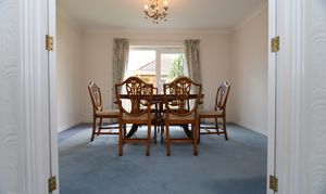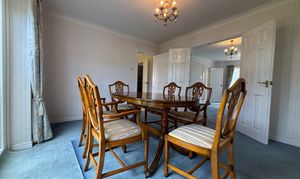 Carpeted with wallpapered walls and a smooth coved ceiling. A radiator and a door leading through to the kitchen. Ample space for a dining table and chairs. Double opening uPVC glazed doors lead out onto the patio.