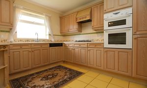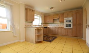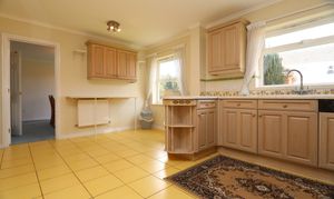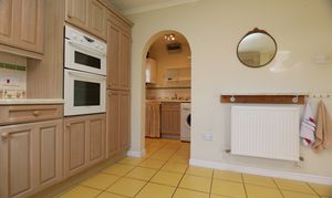 Tiled flooring, smooth walls and a smooth coved ceiling. Two rear aspect windows and two radiators. Matching wooden eye and base level units with complementing worktops. A stainless steel one and a half bowled sink inset with a stainless steel mixer tap overtop. Integrated appliances include a dish washer, four ring gas hob, extractor hood and eye level double oven. There is a breakfast bar, a door leading into the hallway and an archway leading through into a utility room.