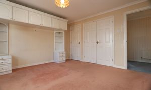 Carpeted with wallpapered walls and a smooth coved ceiling. Two front aspect windows with sea glimpses. A radiator, built in wardrobes and a door leading to an en-suite shower room. Measurements exclude the depth of the built in wardrobes.