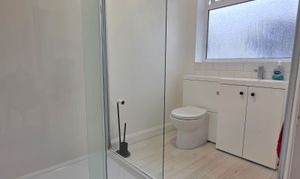 This comprises of a vanity unit with integrated sink with mixer tap plus low level flush WC, walk-in shower cubicle, chrome heated towel rail, vinyl flooring and obscure UPVC double glazed window.